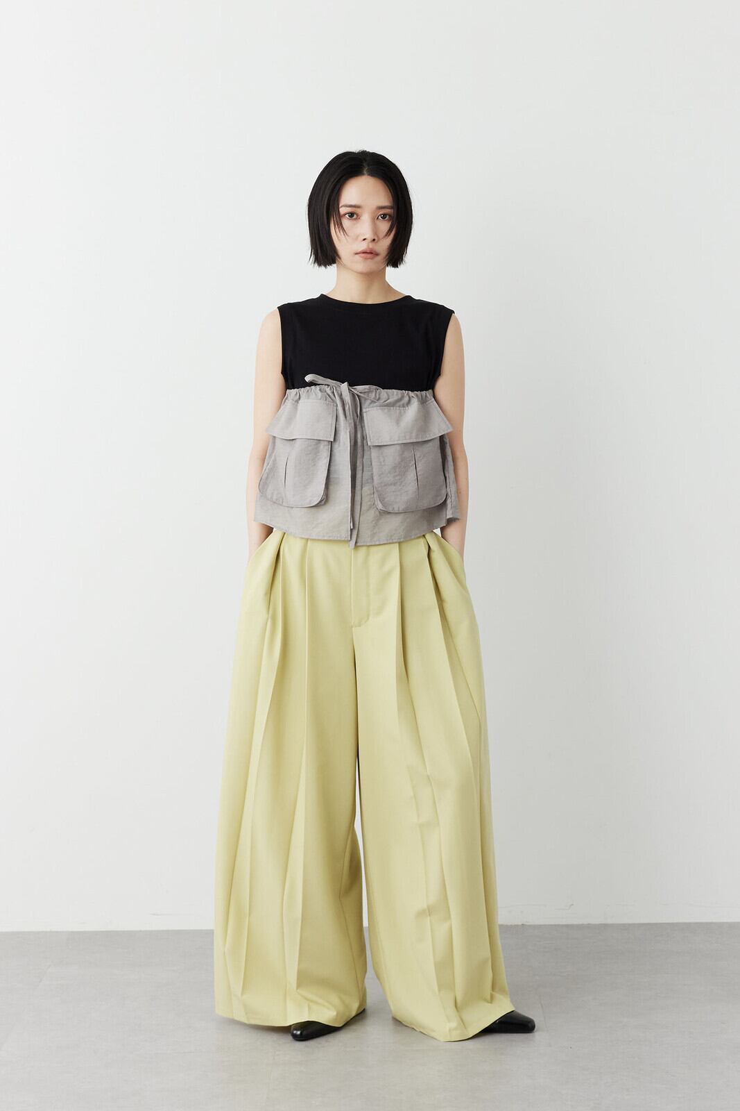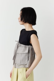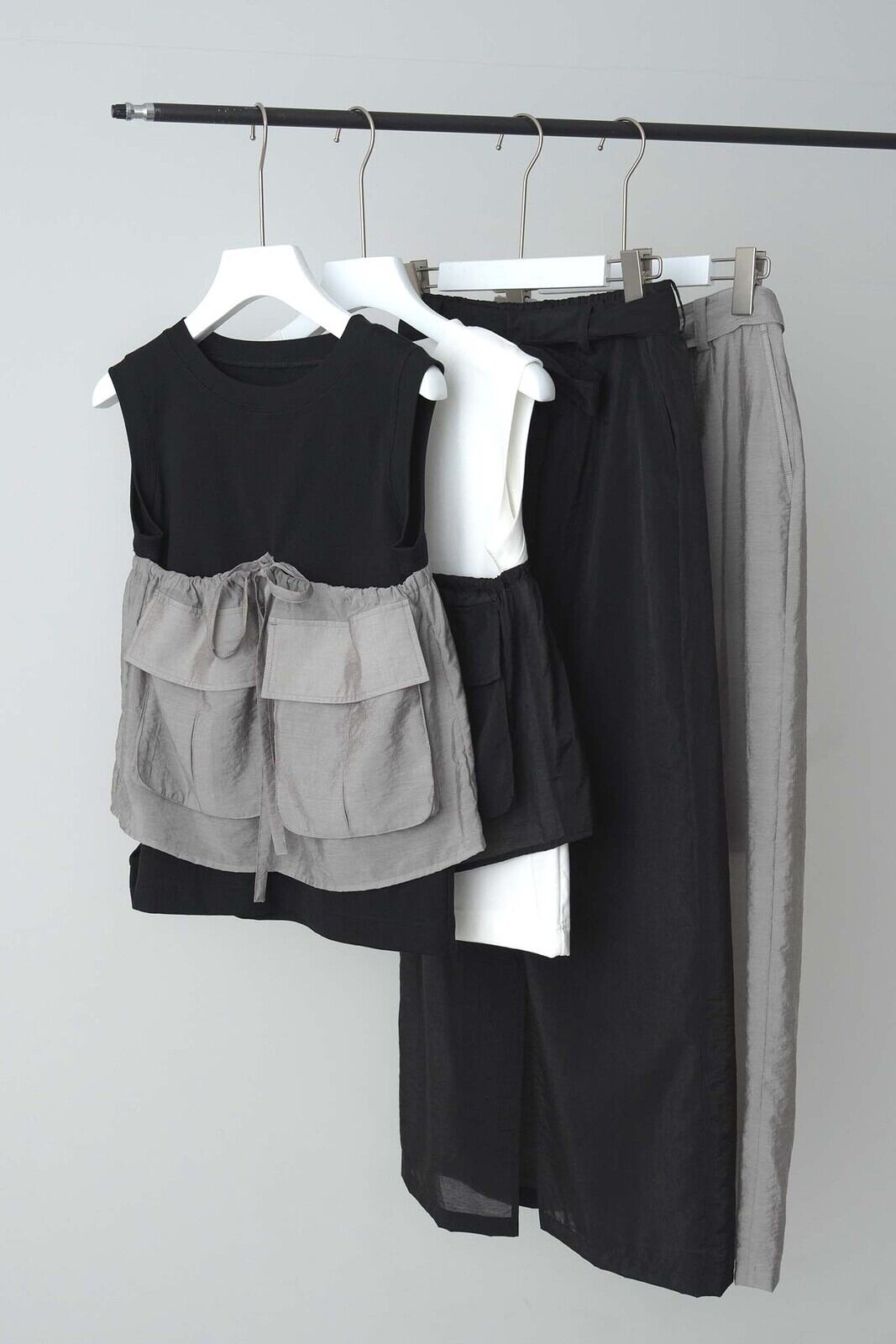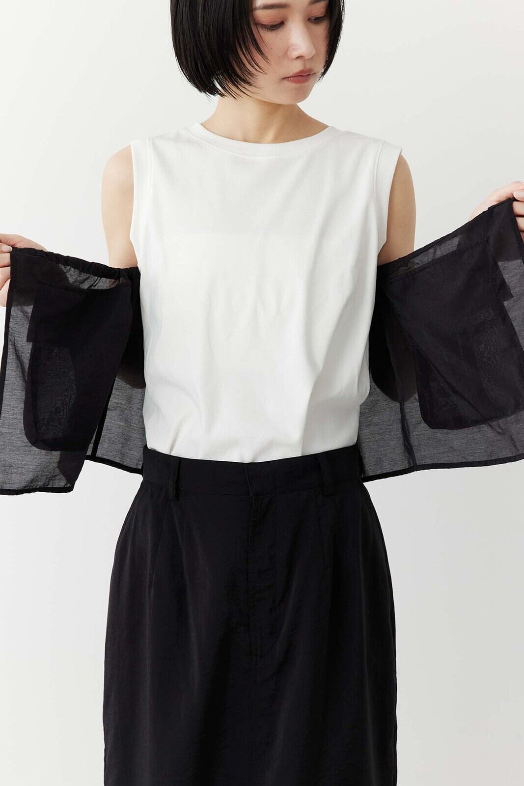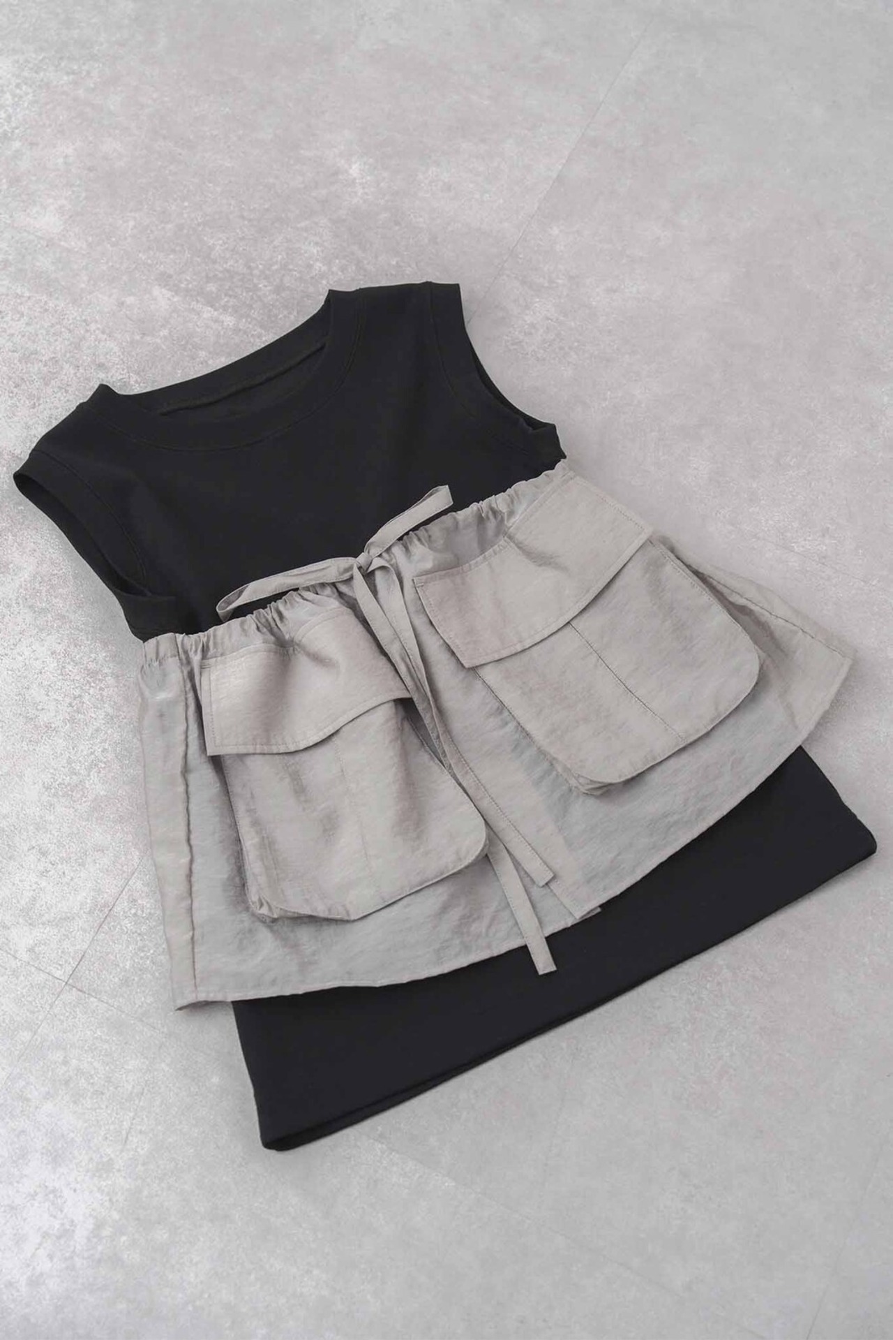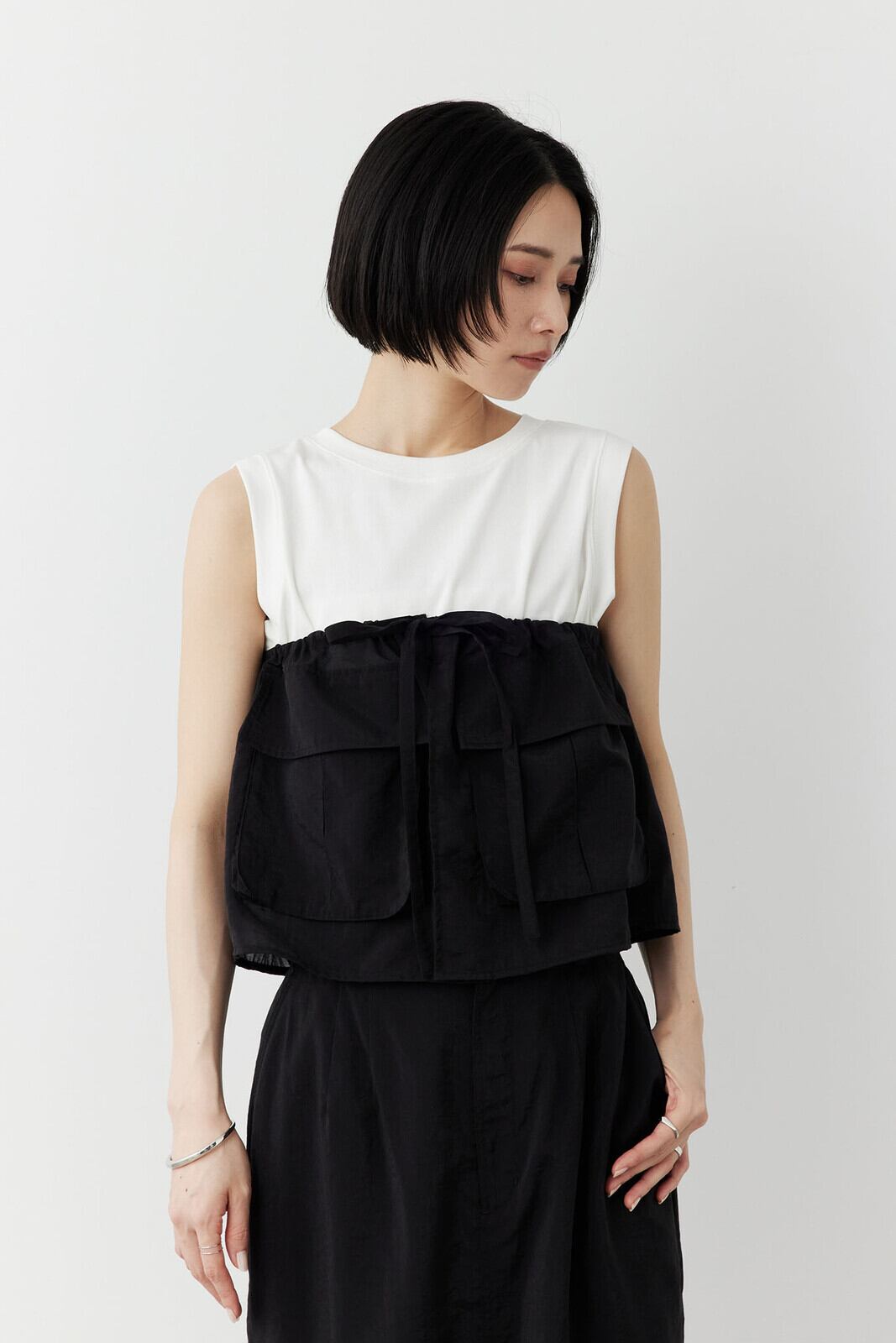 ノースリTシャツ × 異素材使いで、ビスチェレイヤード風に切り替えた技ありデザイン。