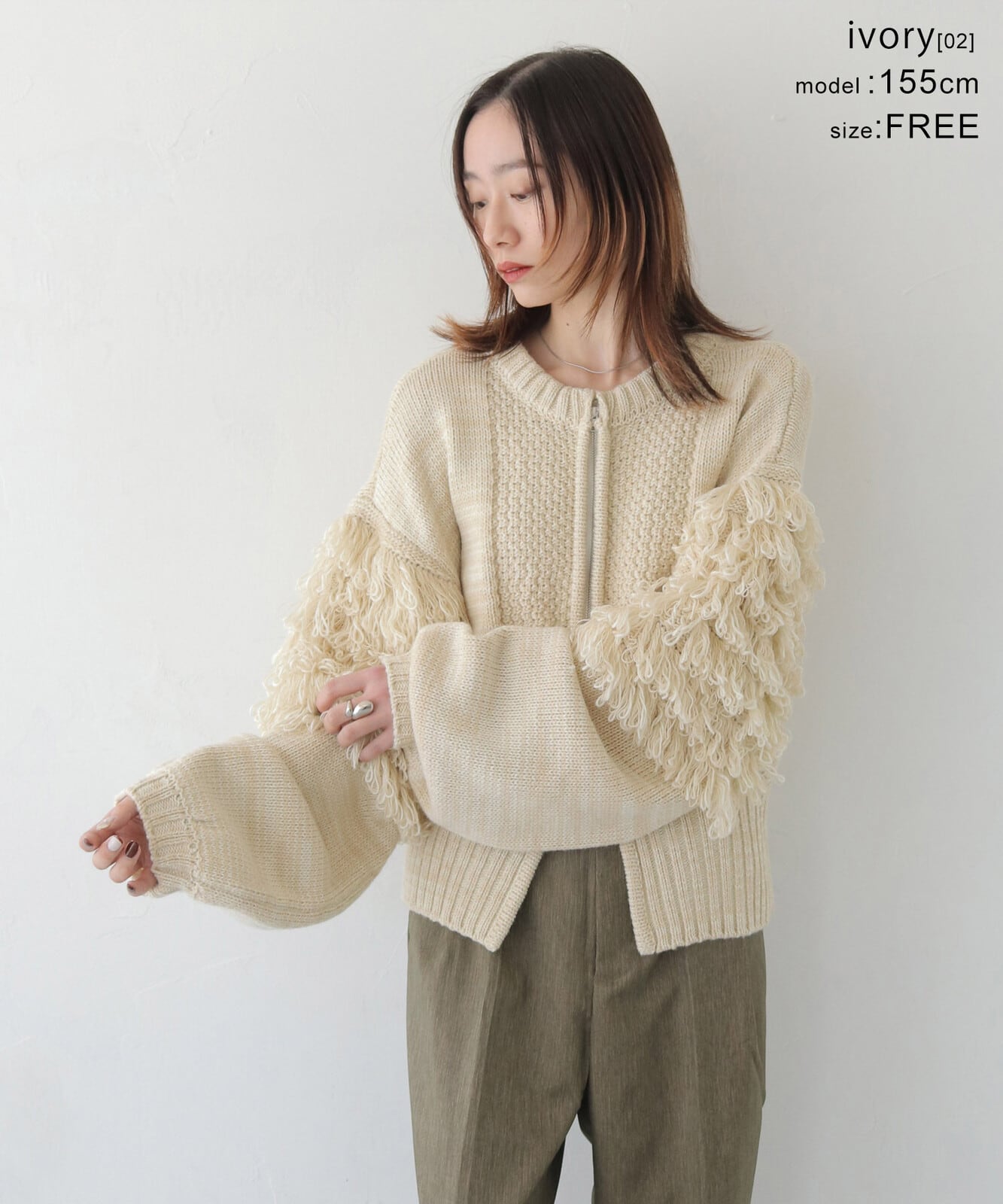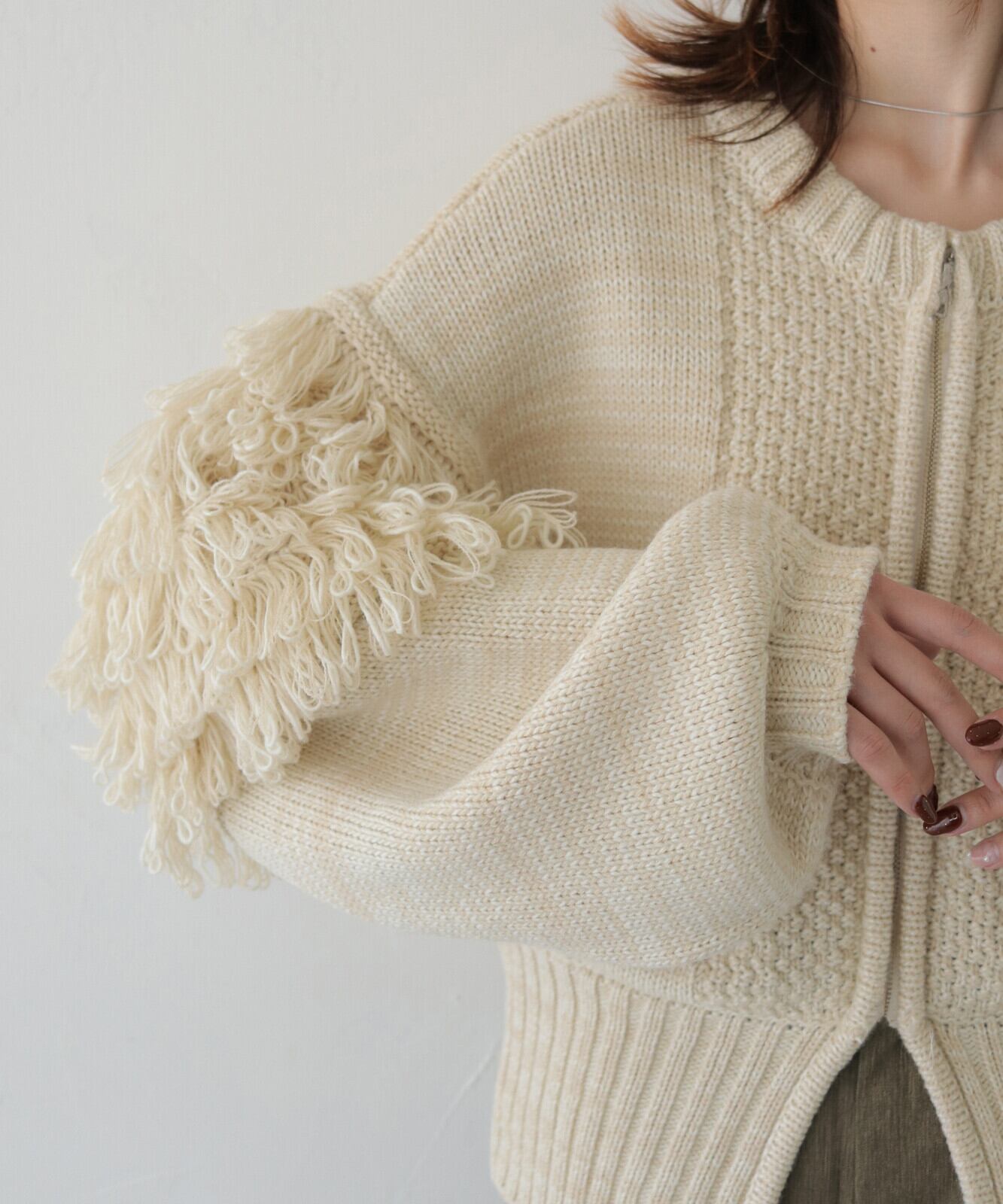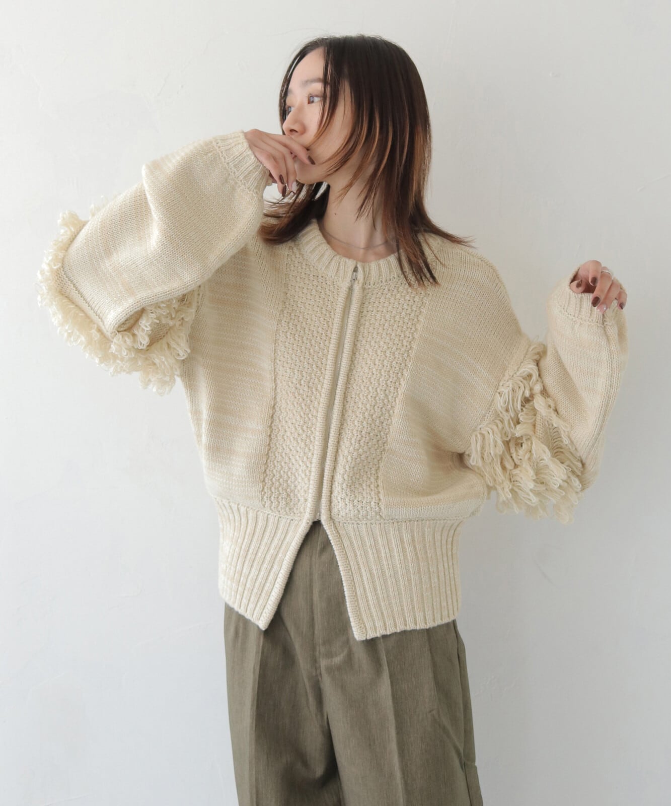 混合糸でのループ編みとジップ下の大きなスリットが特徴で、フリンジ袖のボリューム感も程よくバランスが取れているアイテムです。