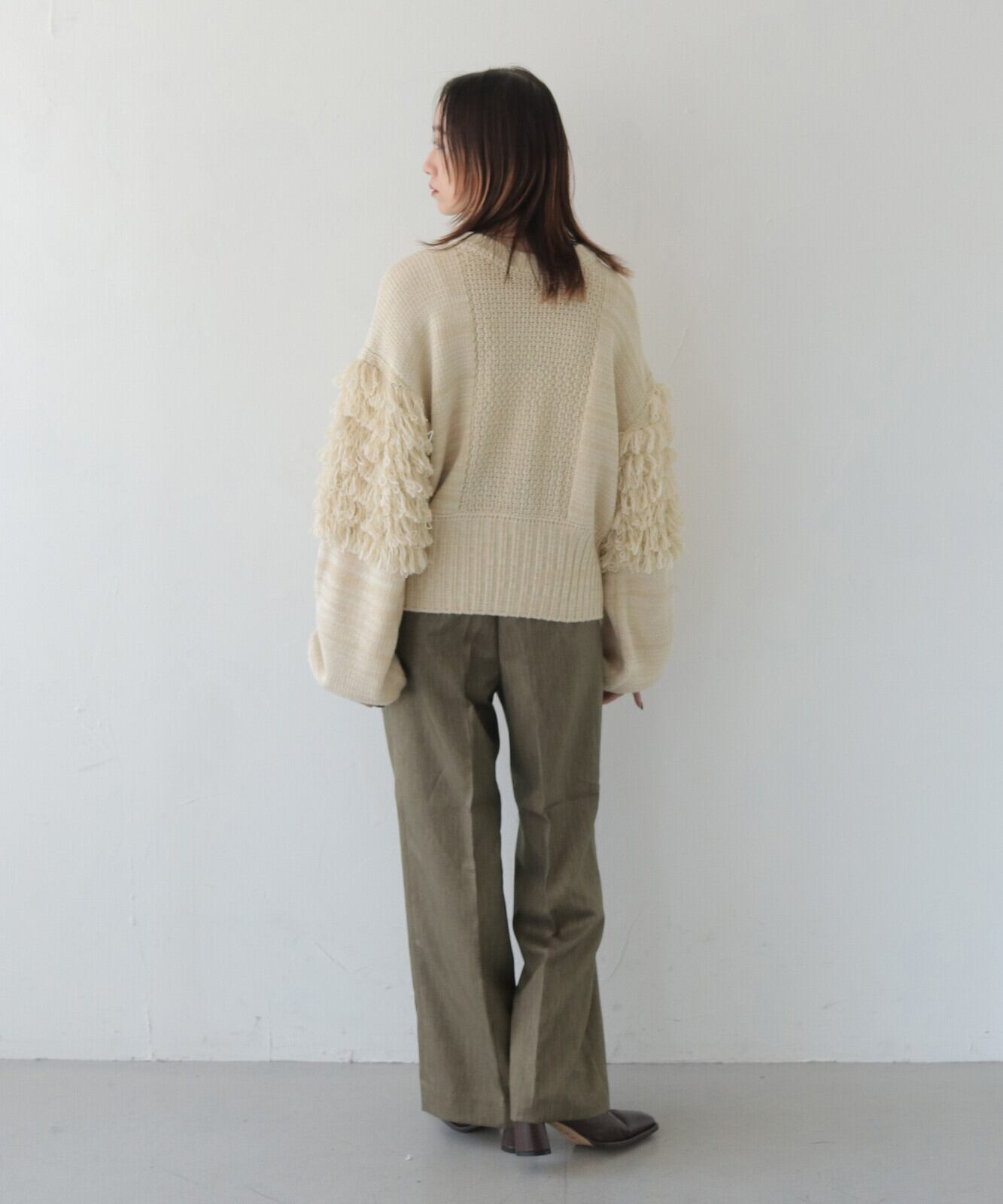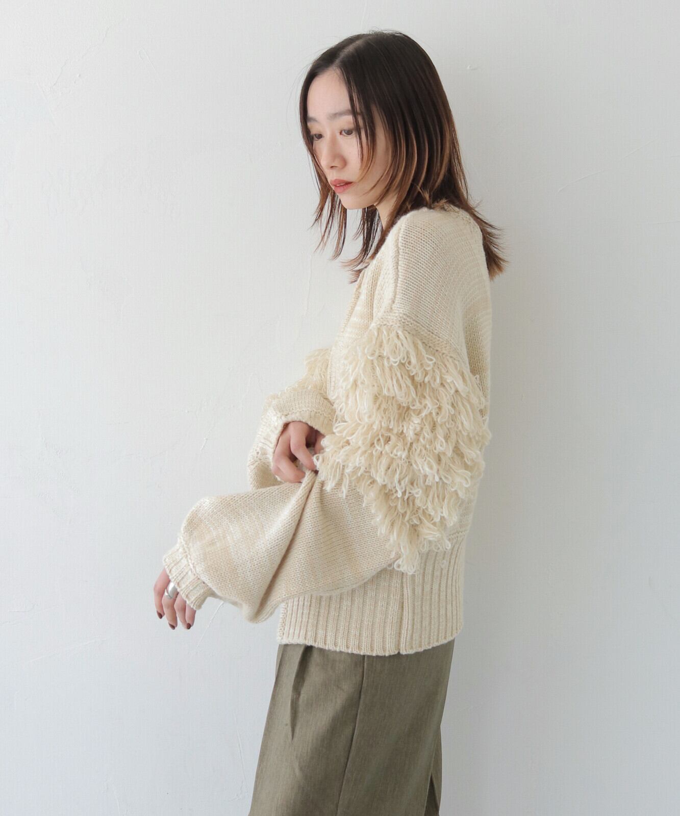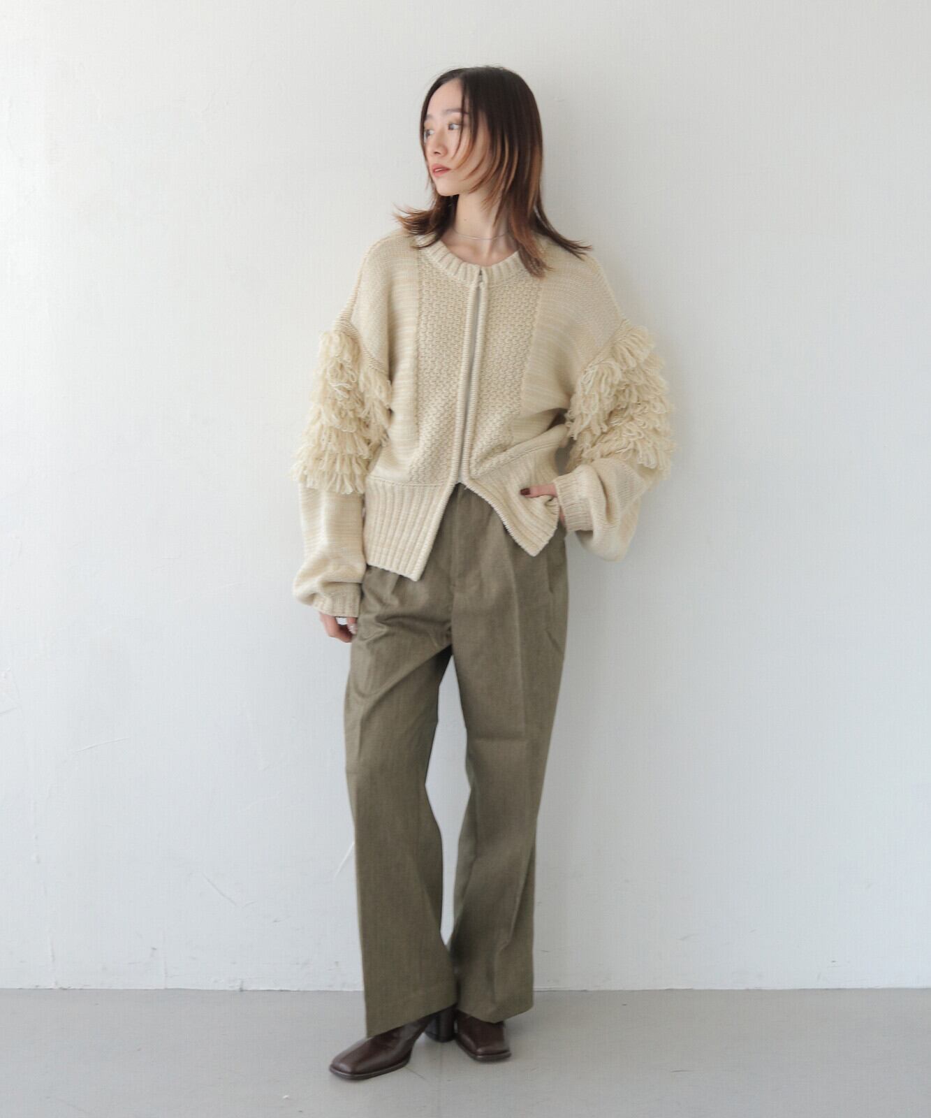 混合糸でのループ編みとジップ下の大きなスリットが特徴で、フリンジ袖のボリューム感も程よくバランスが取れているアイテムです。