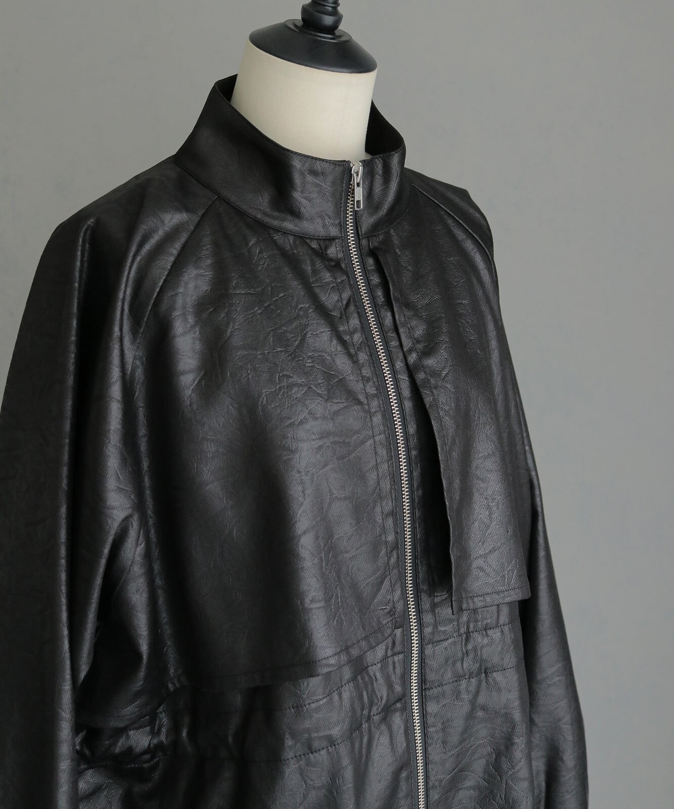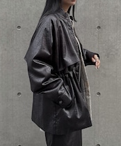上品な光沢を放つツイル生地にエンボス加工を施し、レザーのような質感に仕上げた一着。