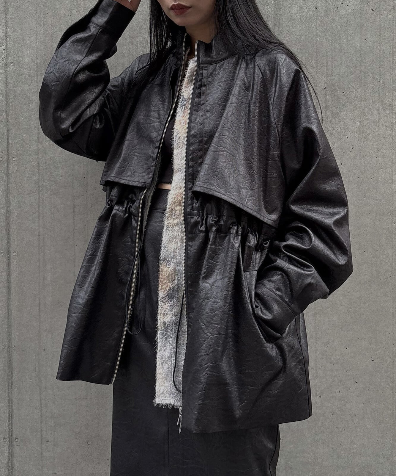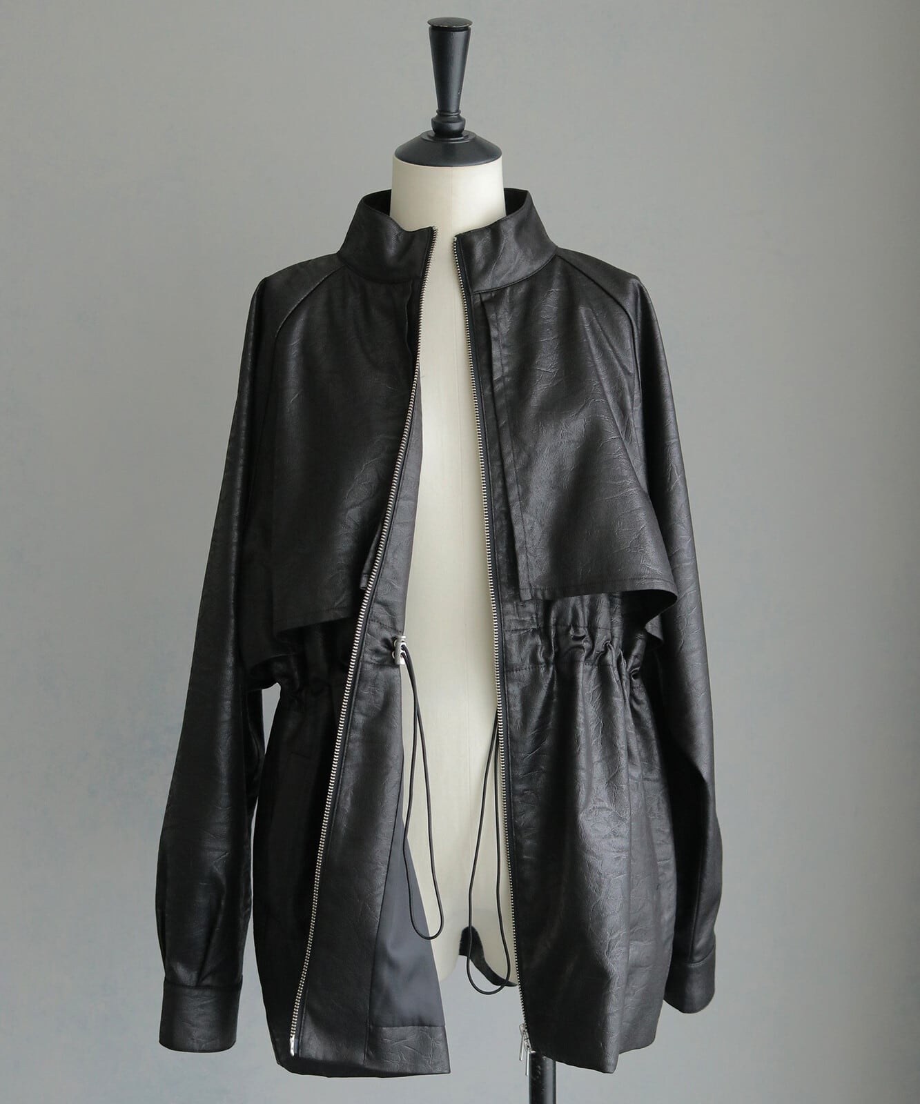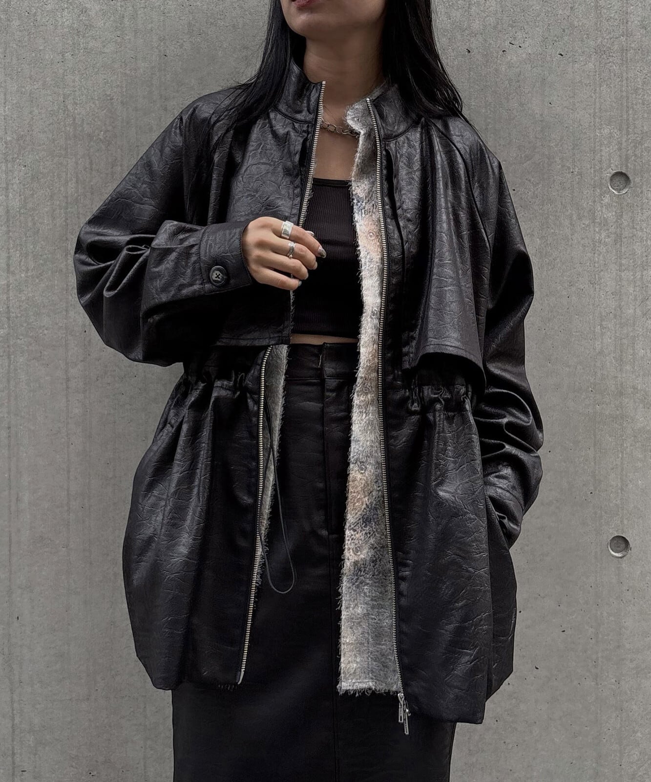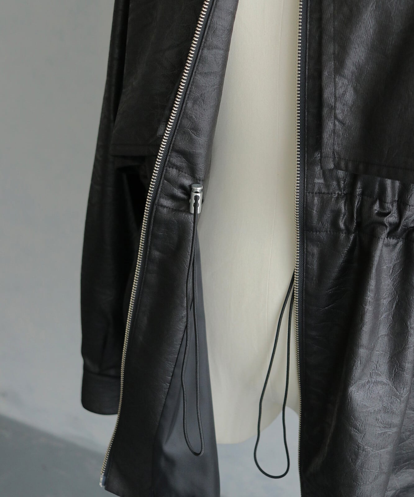 高めのスタンドカラーとシルバージップが、モードな雰囲気を演出。さらにウエスト内側のドロストでシルエットに変化をつけられ、Wジップ仕様によりスタイリングに合わせたアレンジも楽しめます。
