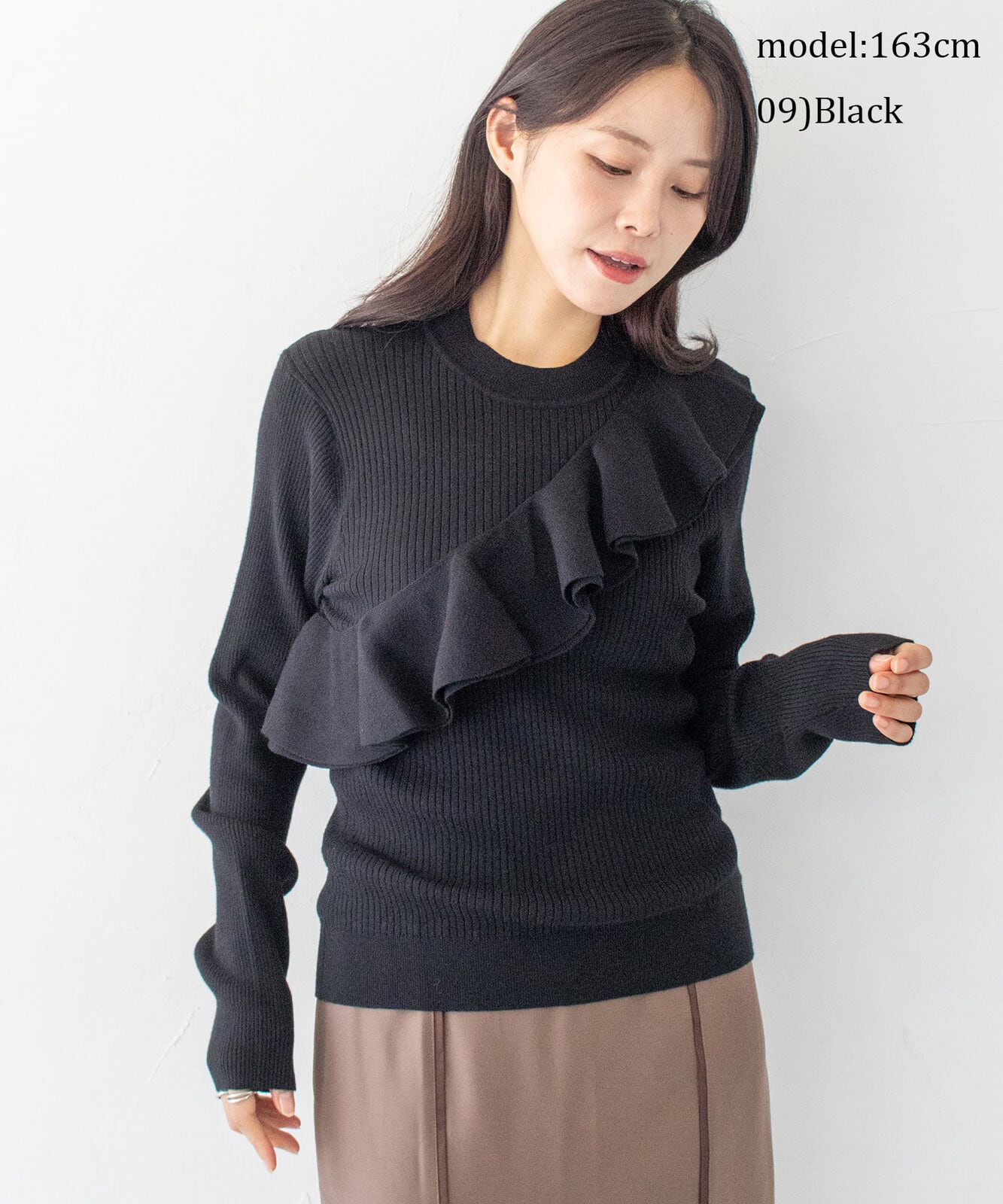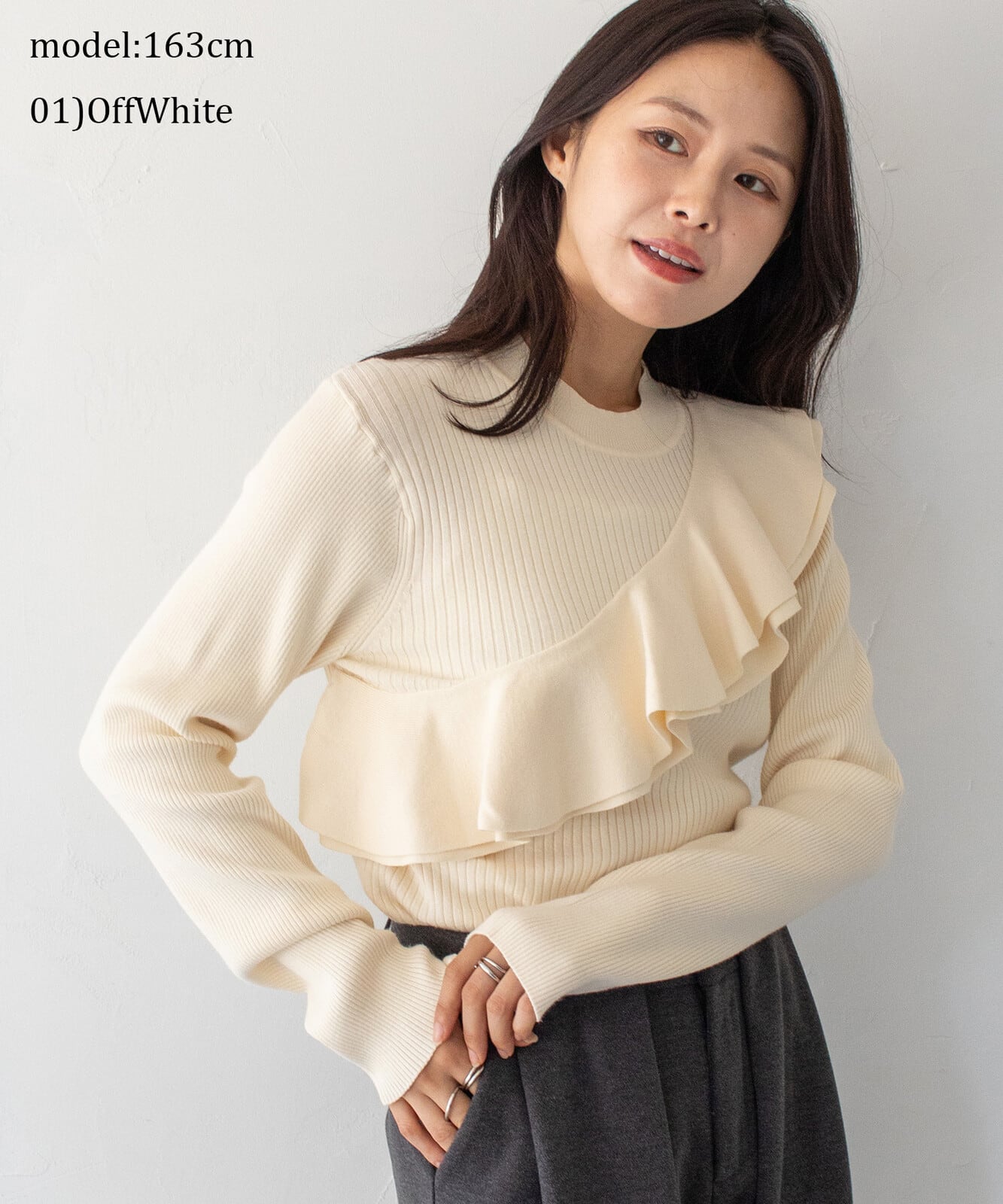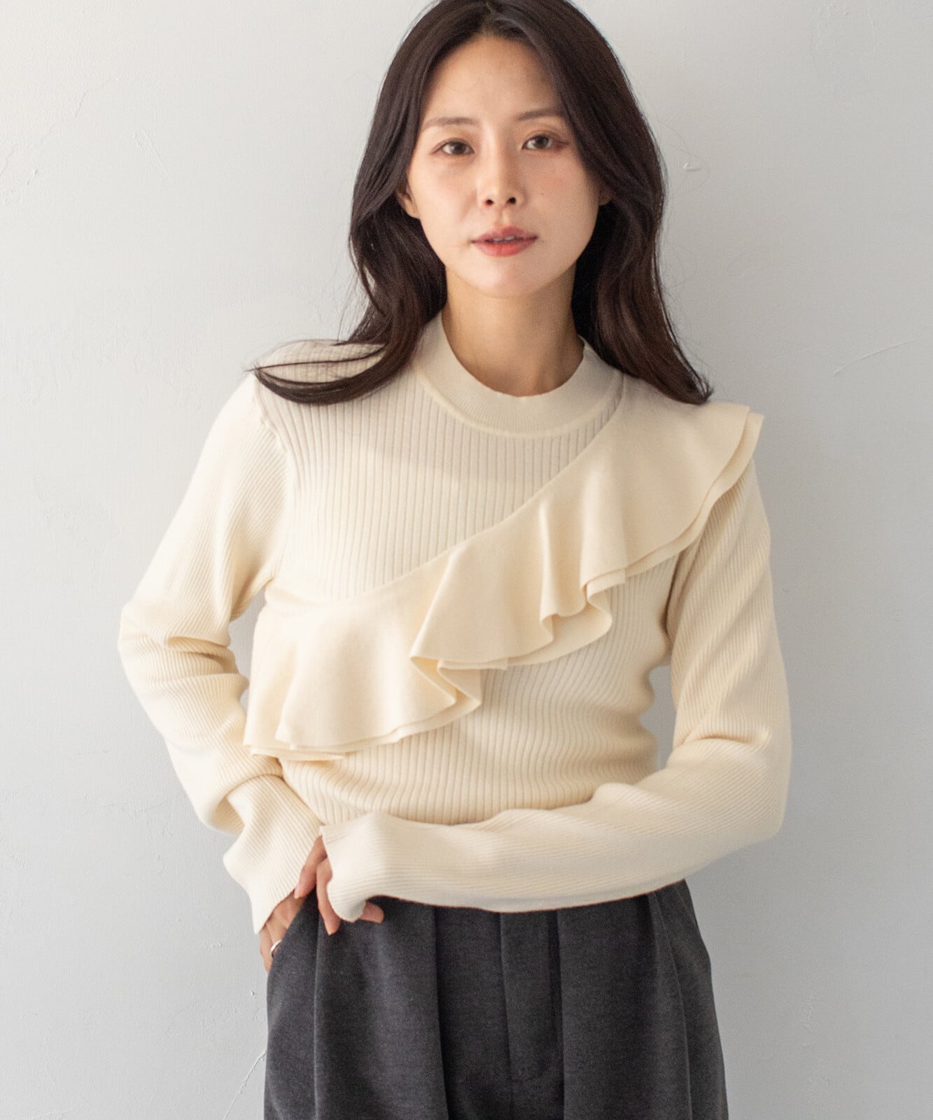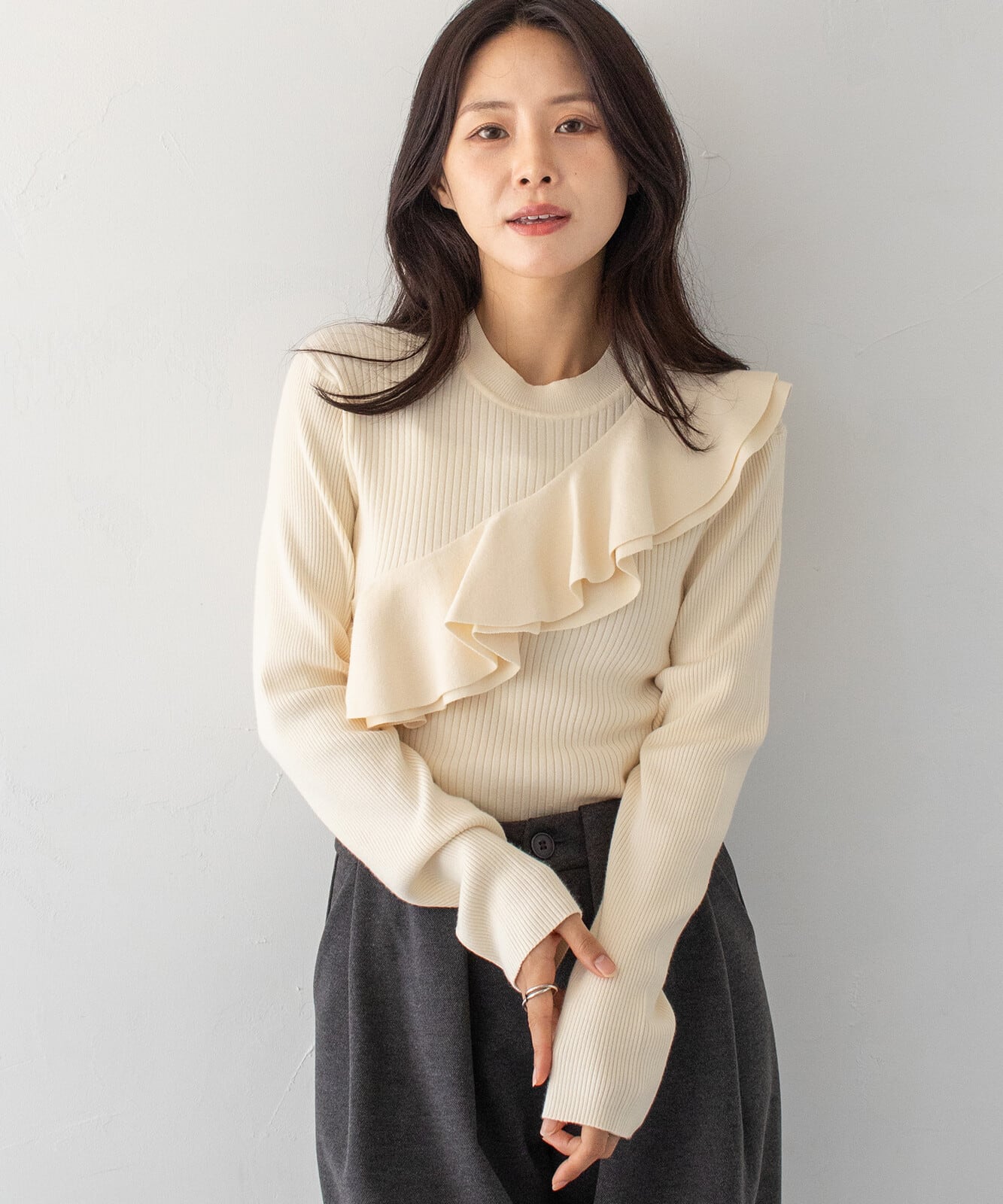 アシンメトリーにつけた立体的なフリルが、顔まわりを華やかに見せて女性らしさをプラス。縦のリブラインがシルエットをスッキリ見せ、上品な印象に。体に程よくフィットし、動きやすく快適な着心地。きちんと感を出しつつ華やかさを忘れないデザイン。スカートでフェミニンに、パンツで大人カジュアルにとオン・オフで幅広く使えます。
