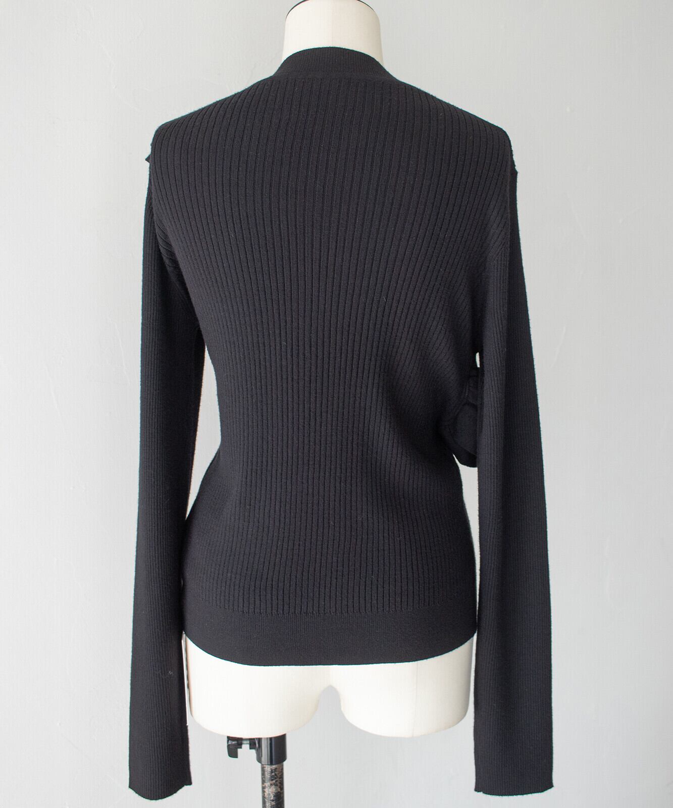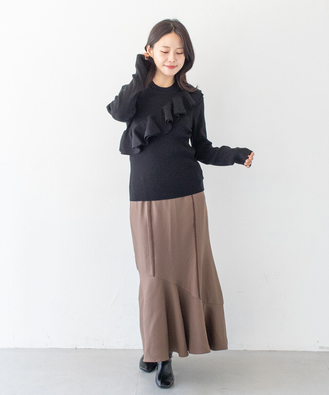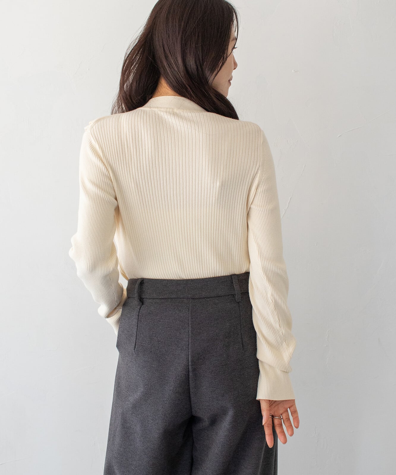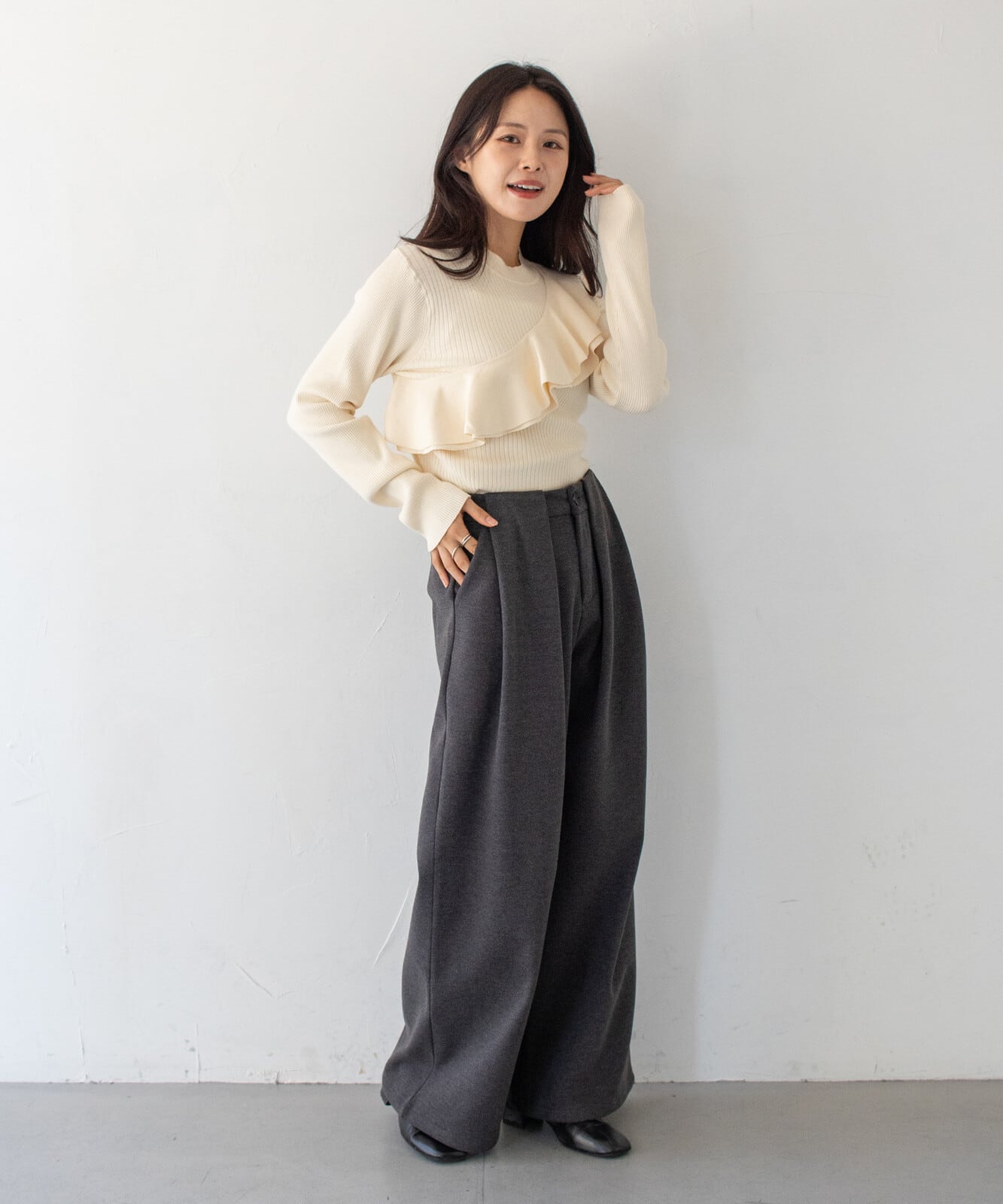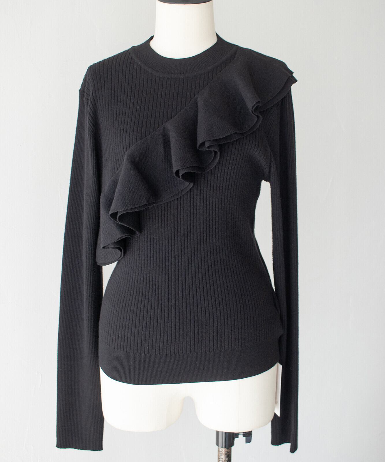 アシンメトリーにつけた立体的なフリルが、顔まわりを華やかに見せて女性らしさをプラス。縦のリブラインがシルエットをスッキリ見せ、上品な印象に。体に程よくフィットし、動きやすく快適な着心地。きちんと感を出しつつ華やかさを忘れないデザイン。スカートでフェミニンに、パンツで大人カジュアルにとオン・オフで幅広く使えます。