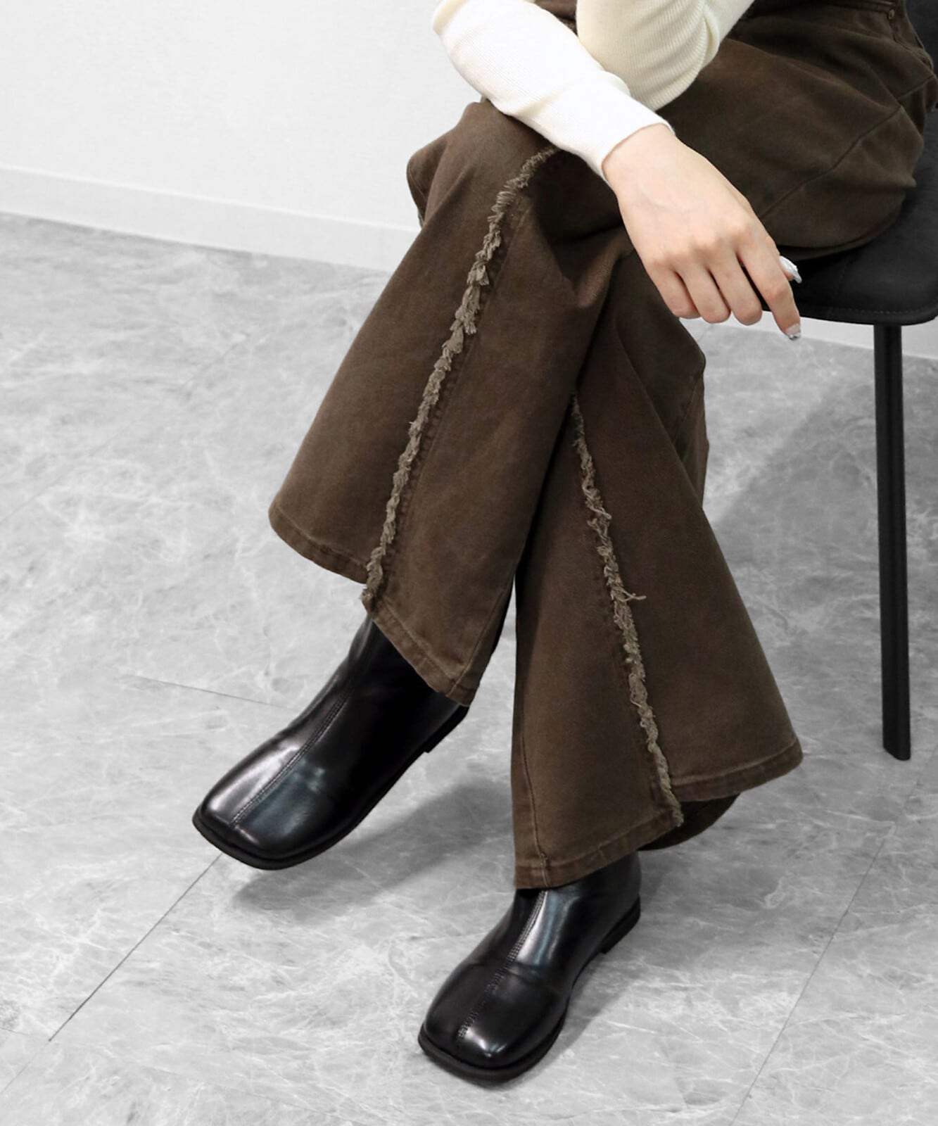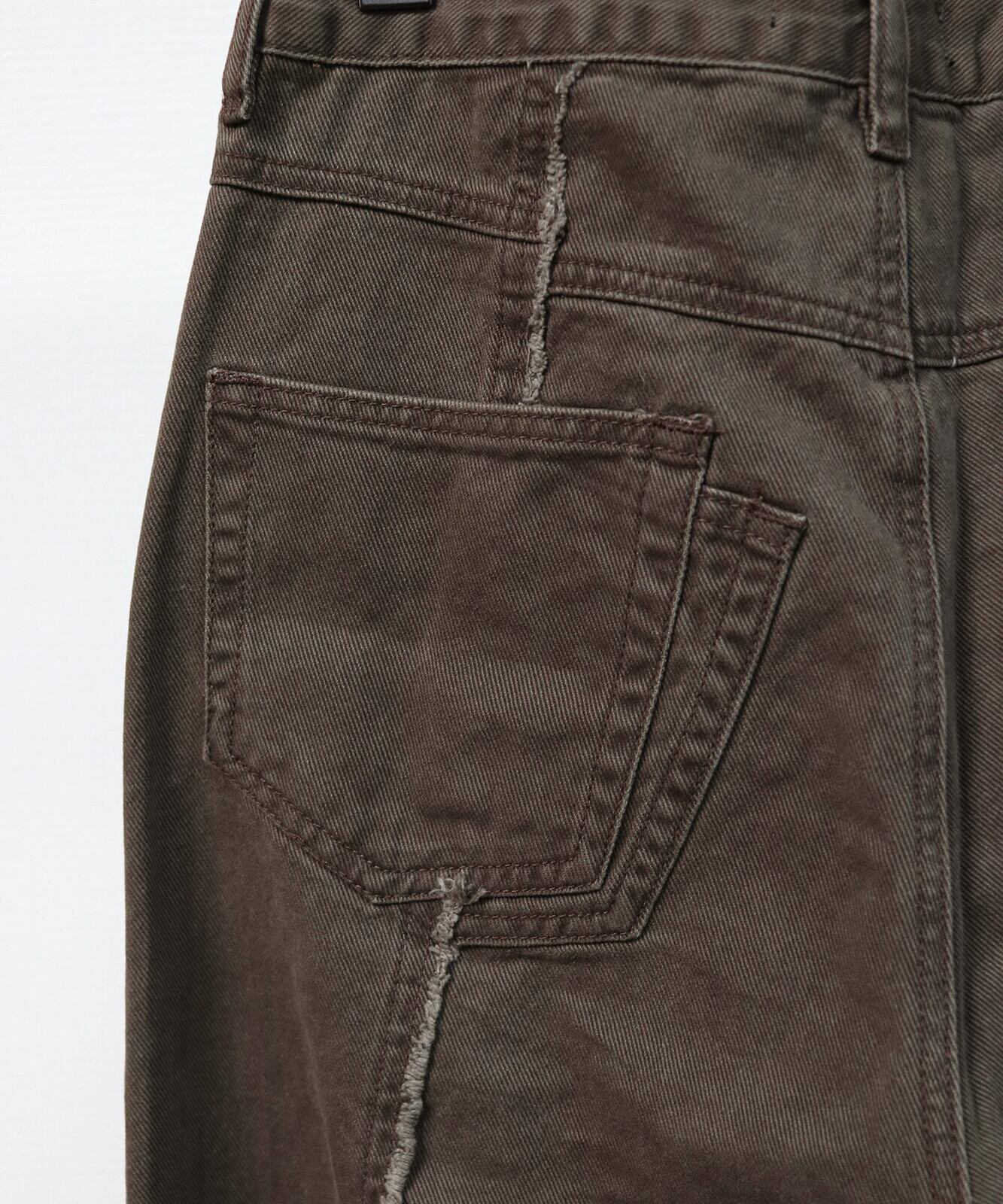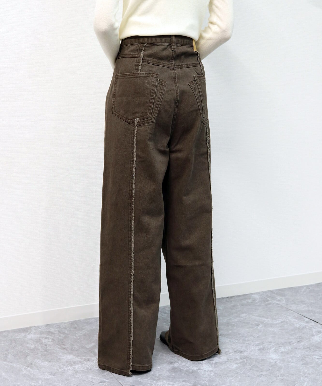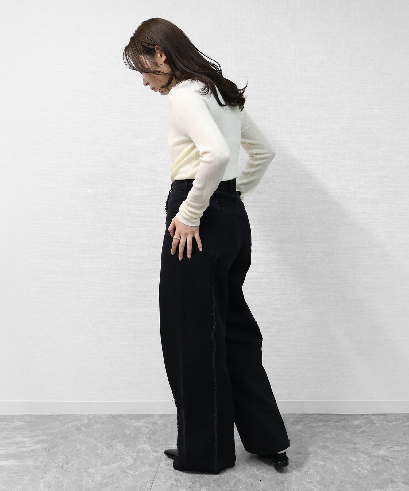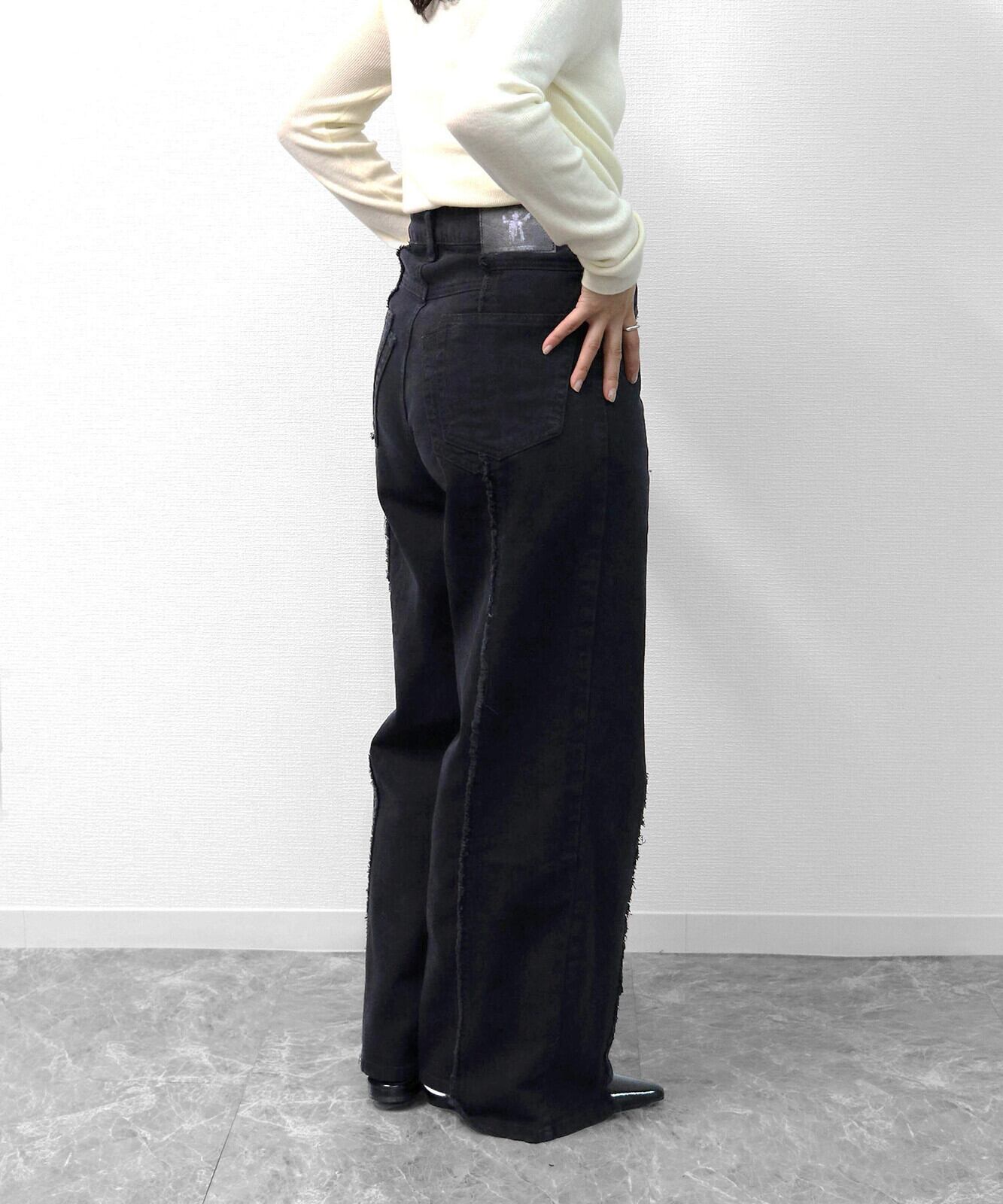 デニム生地でパッチしたような上品なダメージがデザインポイント。縦に走るフリンジラインが脚を長く細く見せる効果も◎