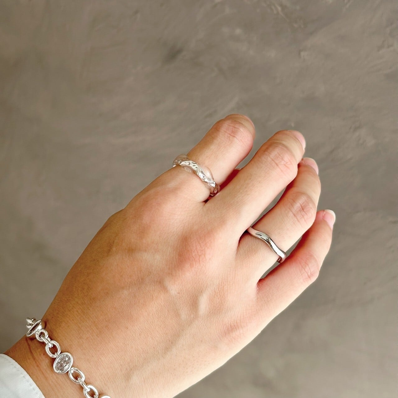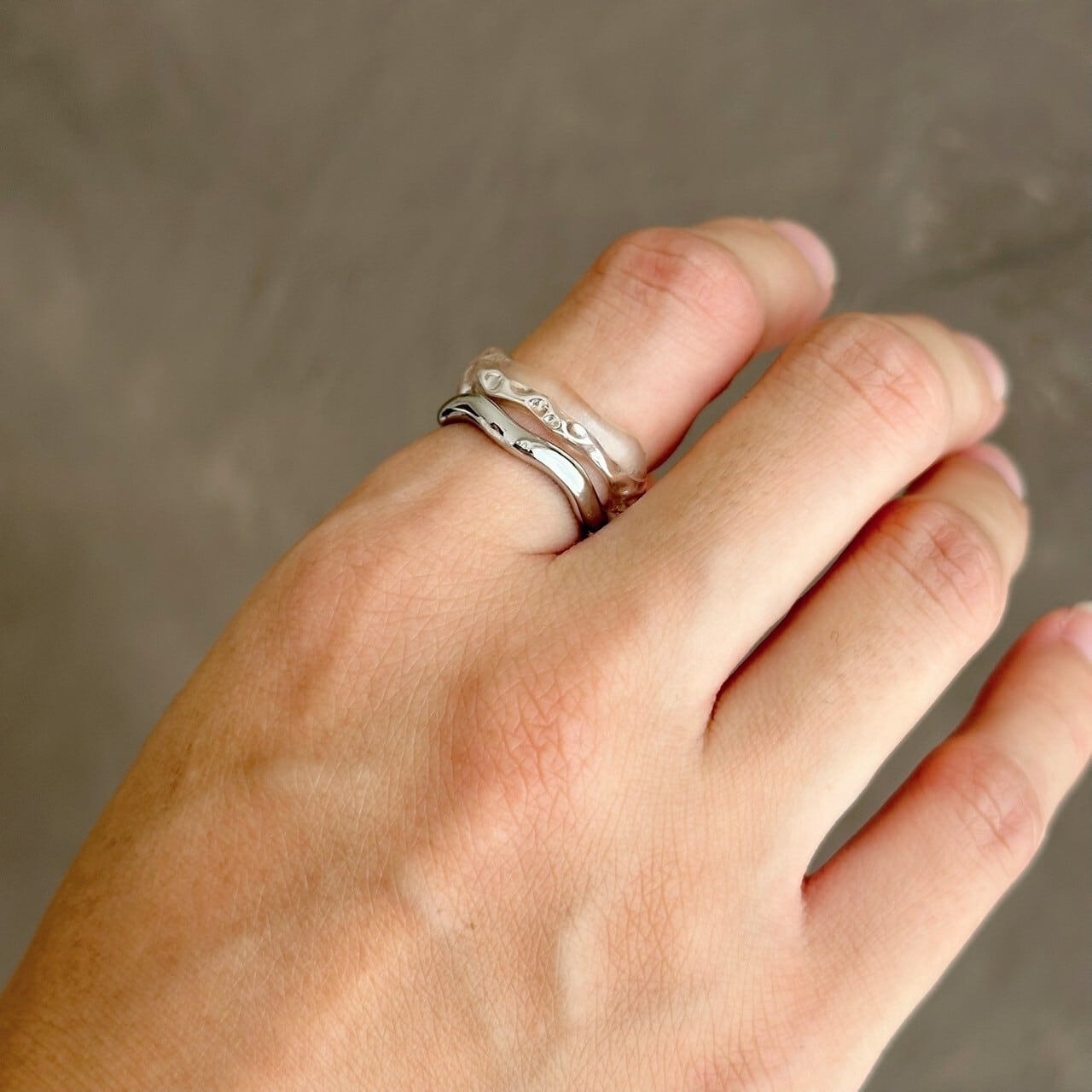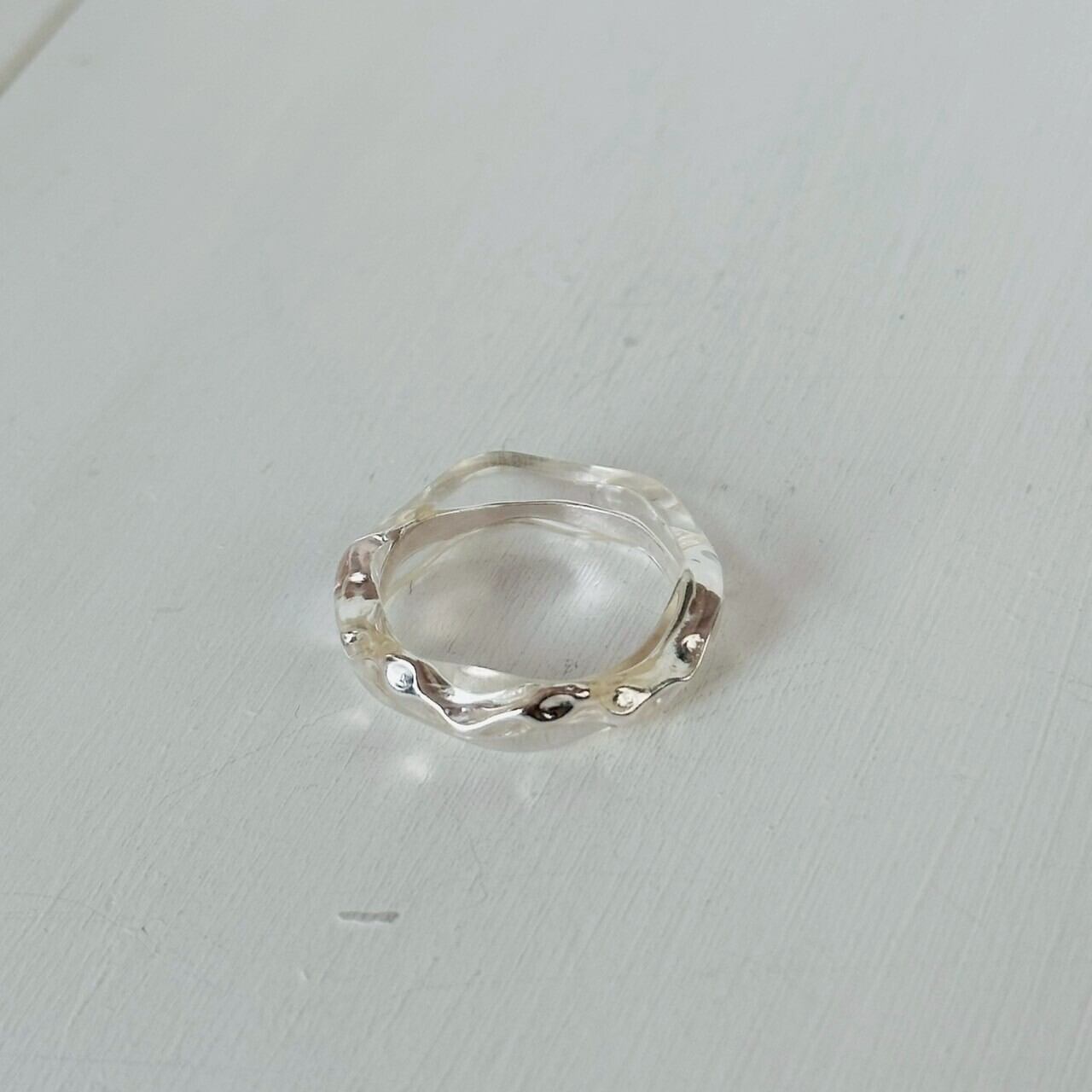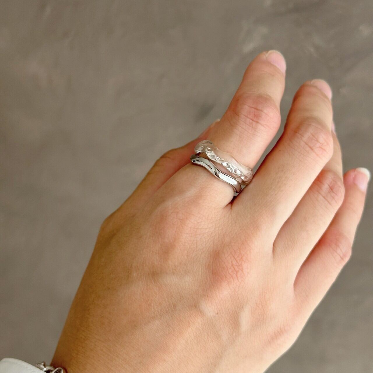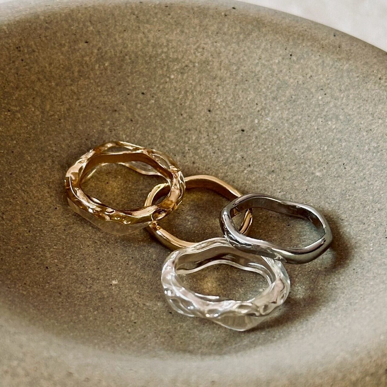 シンプルながらも有機的なウェーブデザインが特徴のメタルとクリア樹脂のリングセット。