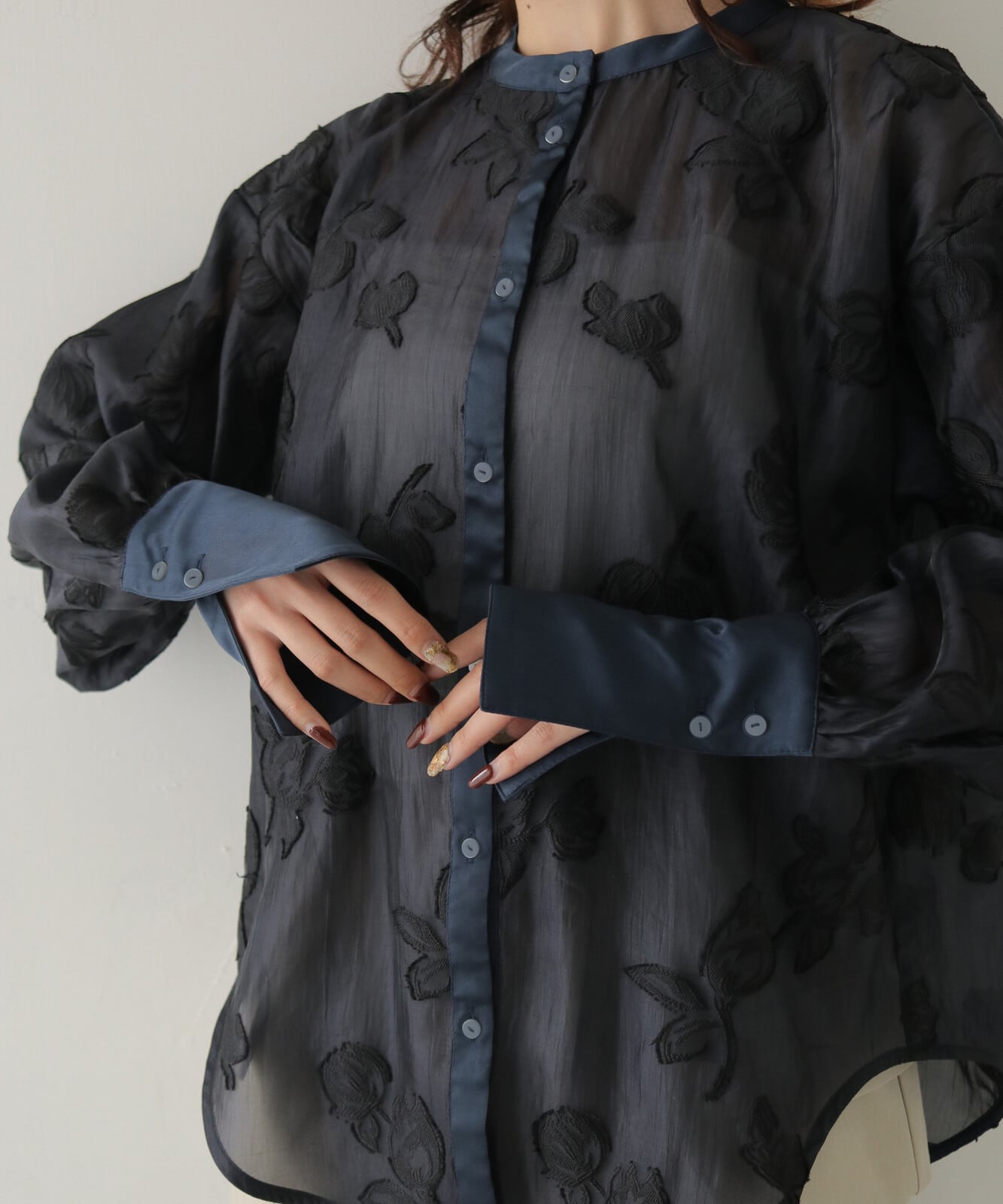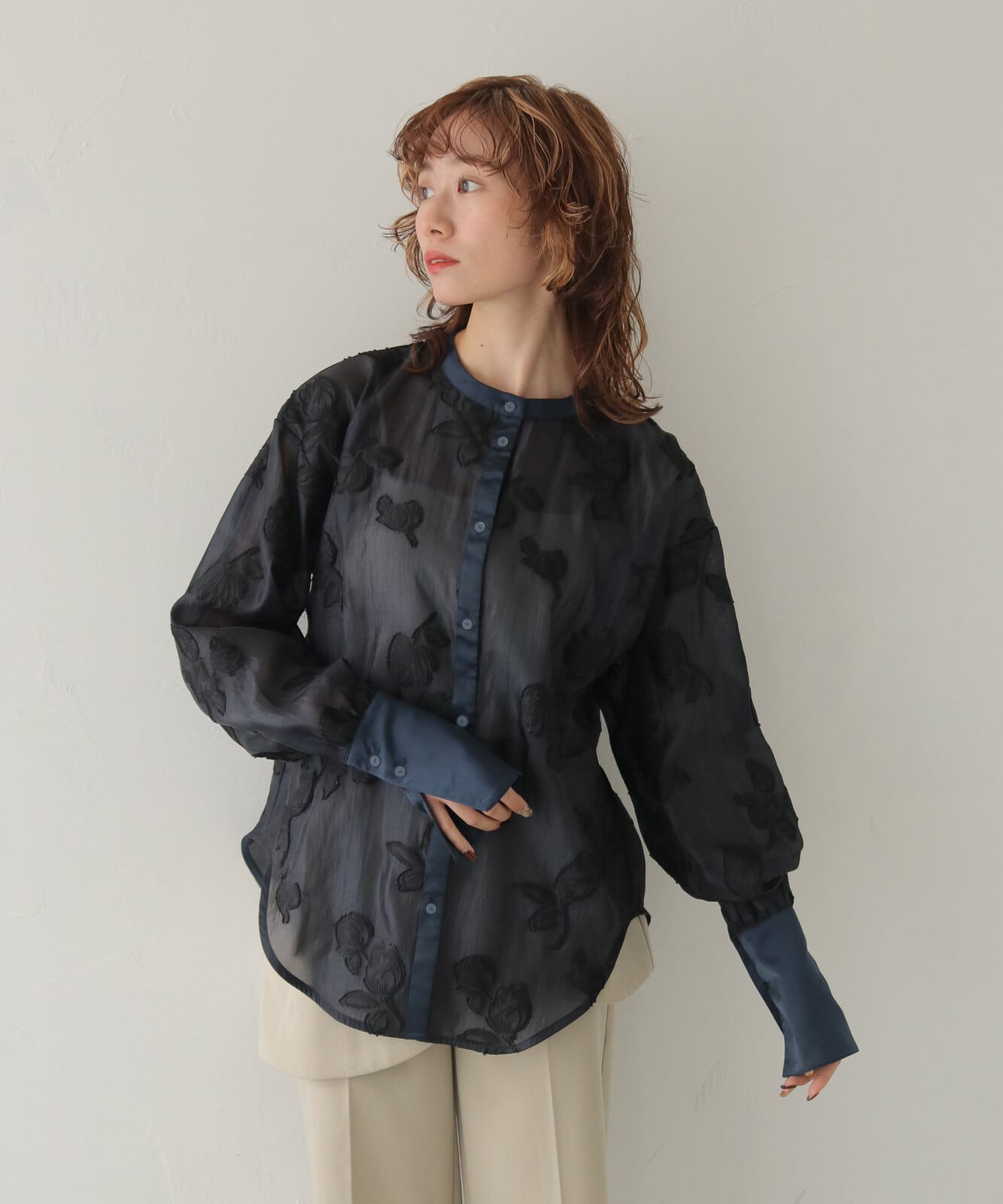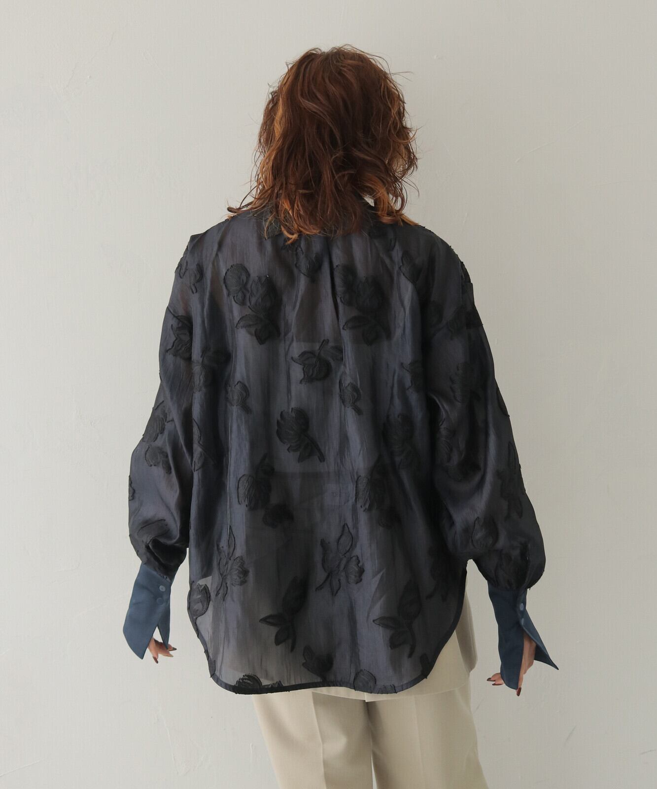【POINT】チューリップモチーフのジャガードを施したシアー素材を使用したシャツ。衿・カフス・前立てにはサテン生地を切り替えて、上品で華やかな印象に仕上げています。カフスを長めに設計することで、ふんわりとしたシアーのシルエットにほどよくメリハリが生まれ、手元をすっきりと華奢に見せてくれます。落ち着いたカラー展開で、デイリーにもオケージョンにも使いやすく、幅広いシーンで活躍する一枚です。