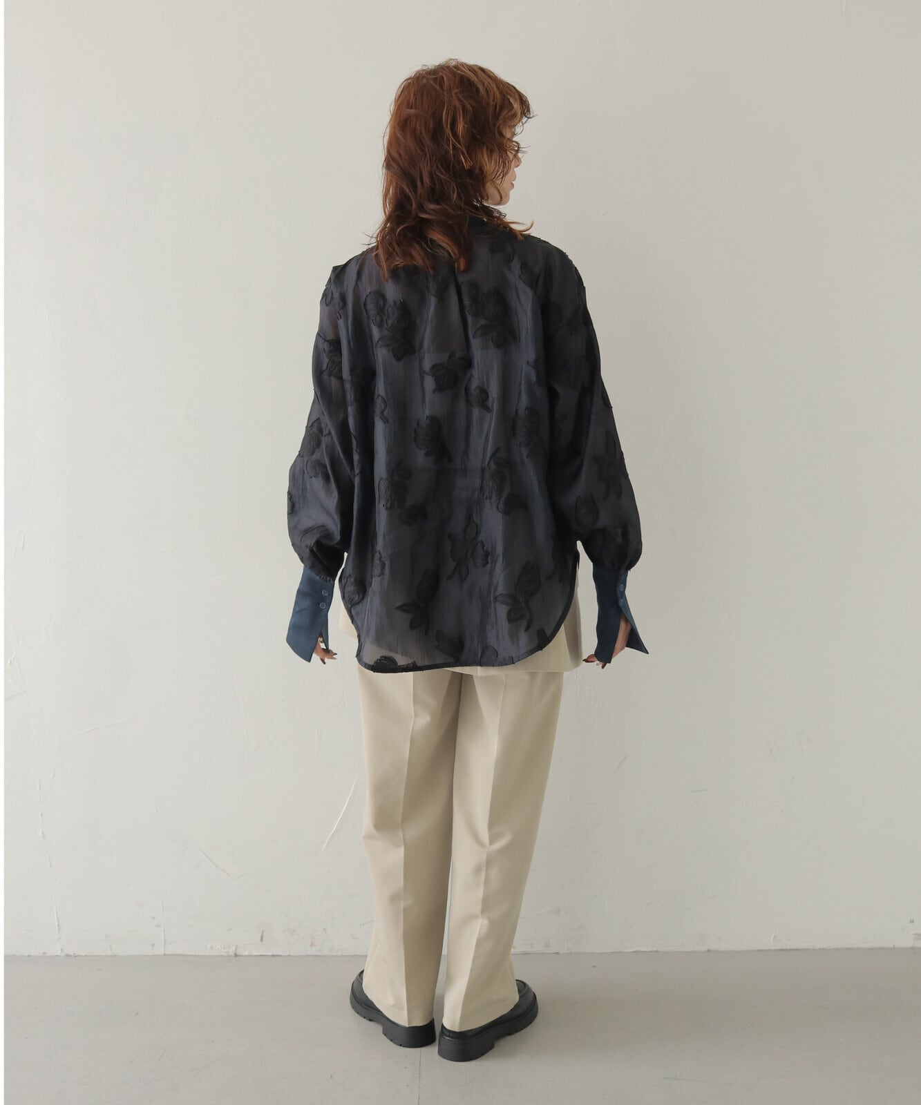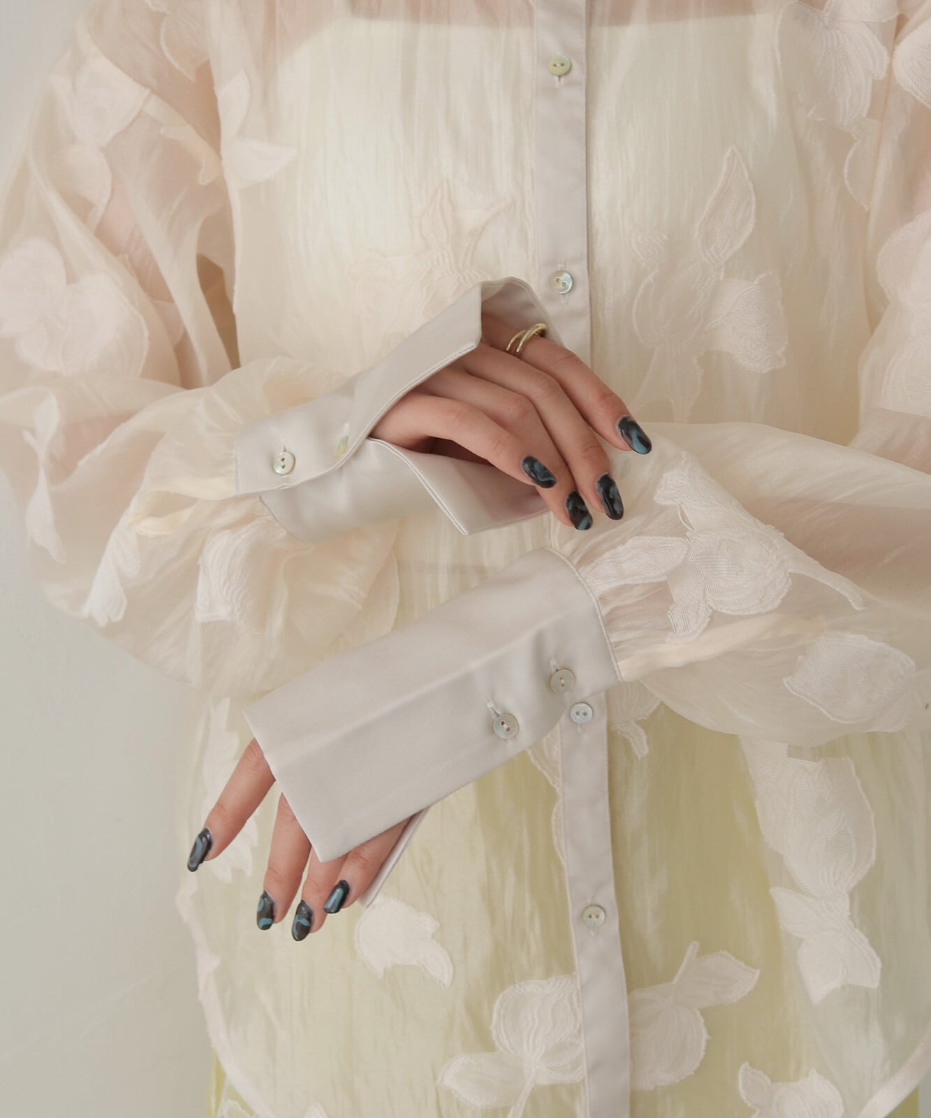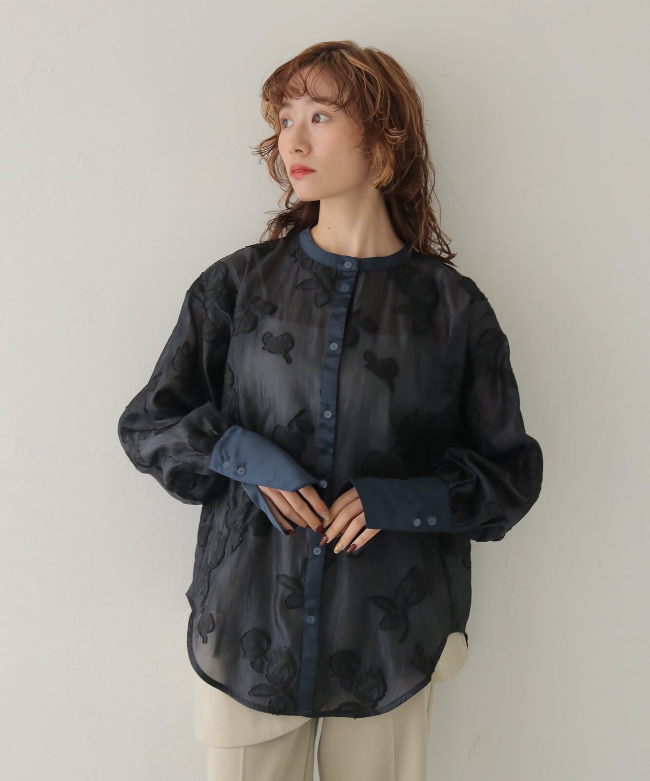 【POINT】チューリップモチーフのジャガードを施したシアー素材を使用したシャツ。衿・カフス・前立てにはサテン生地を切り替えて、上品で華やかな印象に仕上げています。カフスを長めに設計することで、ふんわりとしたシアーのシルエットにほどよくメリハリが生まれ、手元をすっきりと華奢に見せてくれます。落ち着いたカラー展開で、デイリーにもオケージョンにも使いやすく、幅広いシーンで活躍する一枚です。