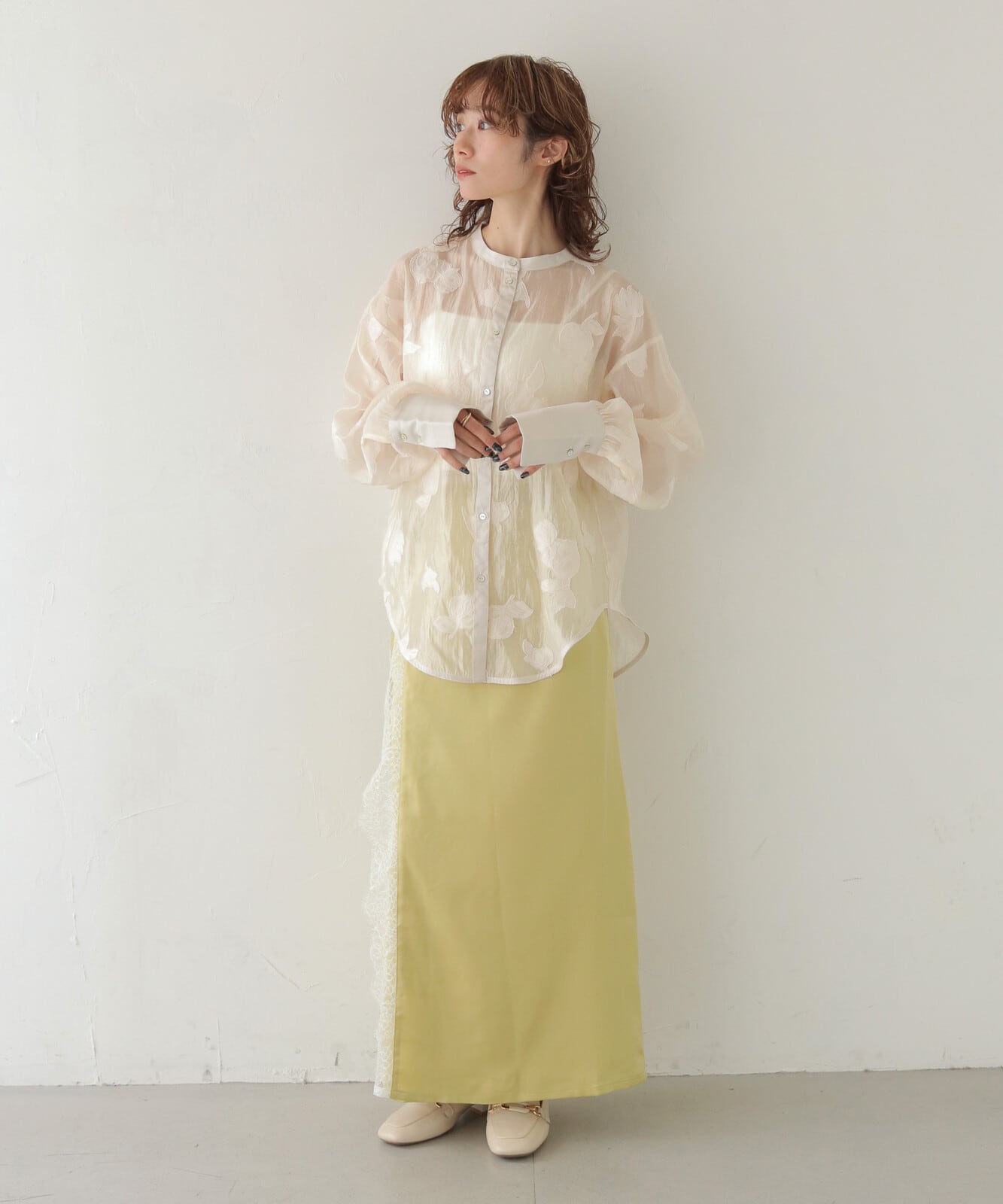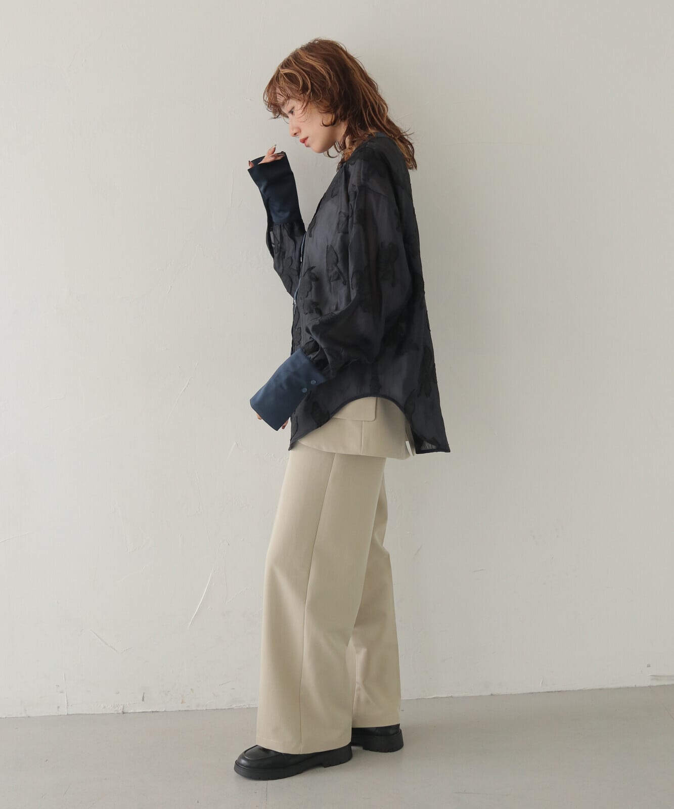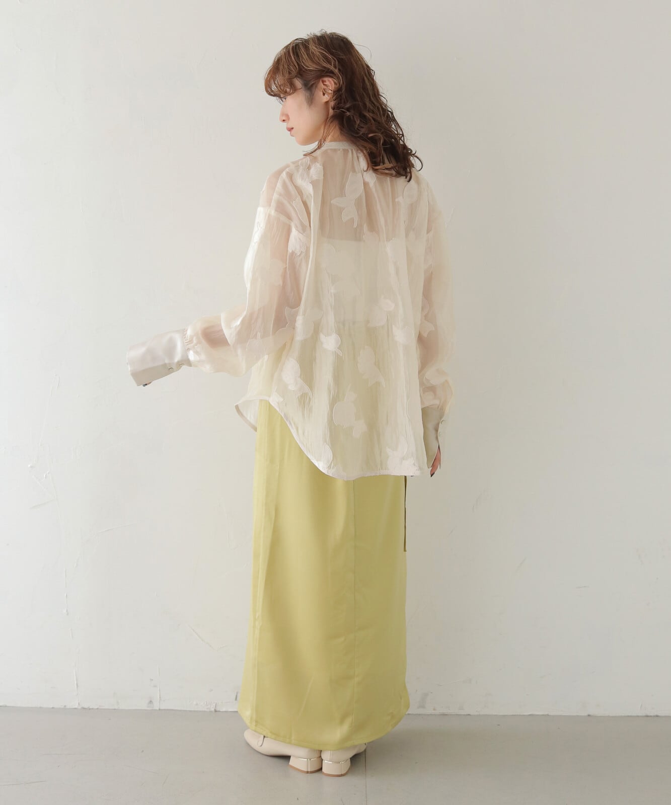 【STYLING】シンプルなストレートパンツ・ワイドパンツ・タイトスカートと合わせると、シアーシャツの華やかな表情が引き立ち、落ち着きのある上品なスタイルにまとまります。同系色のボトムスを合わせると、オケージョンにも対応した洗練コーデに仕上がります◎