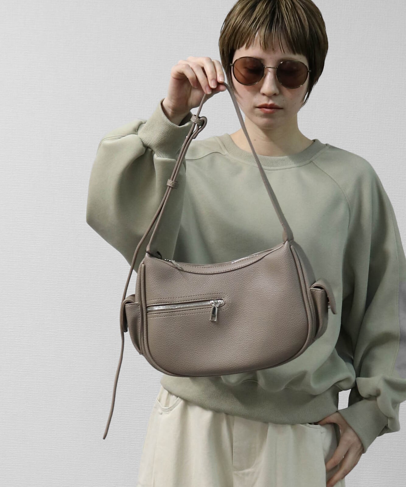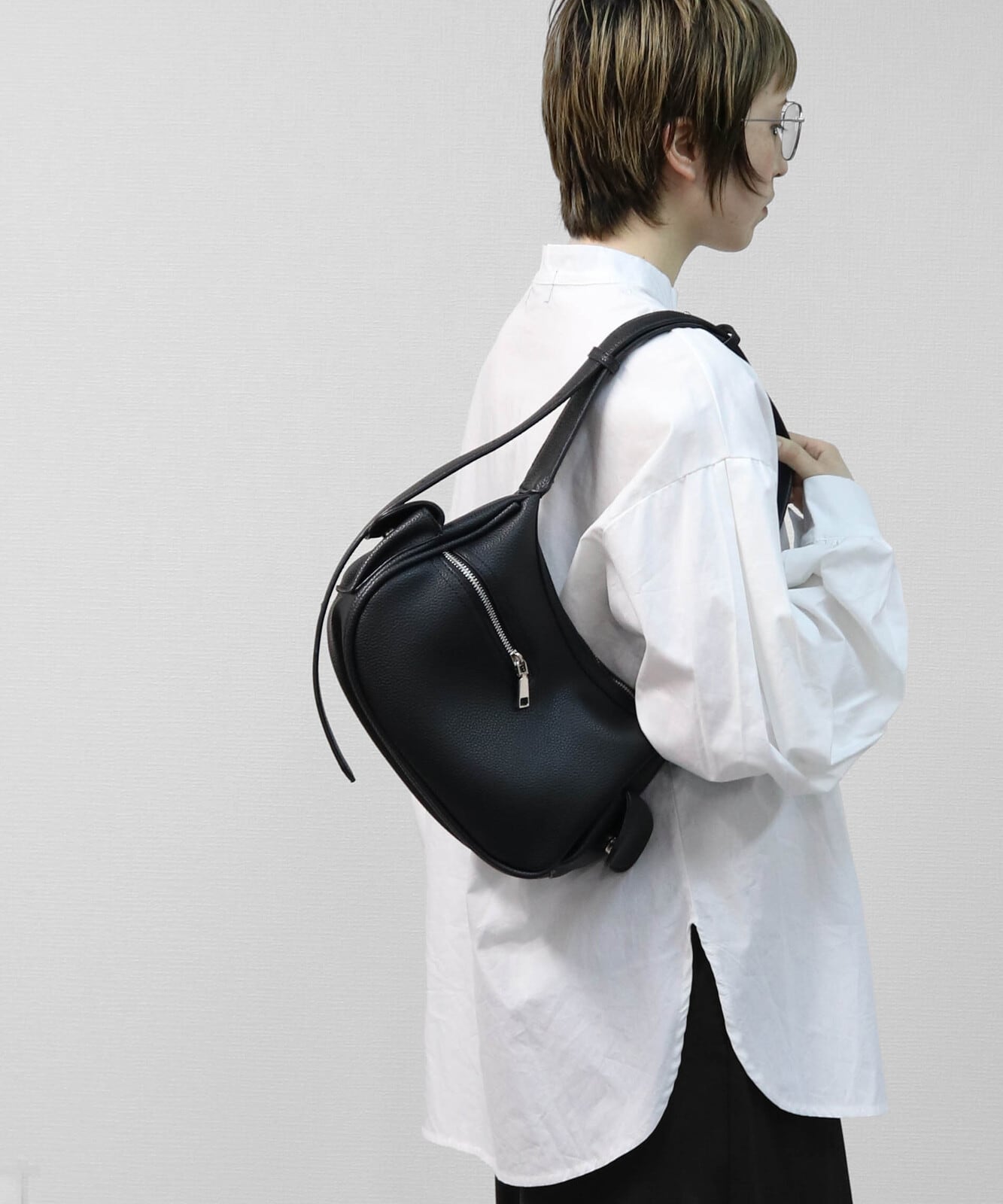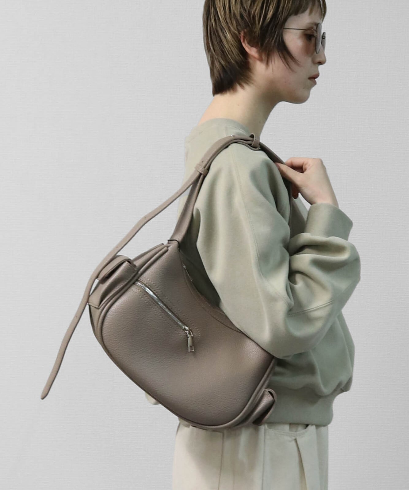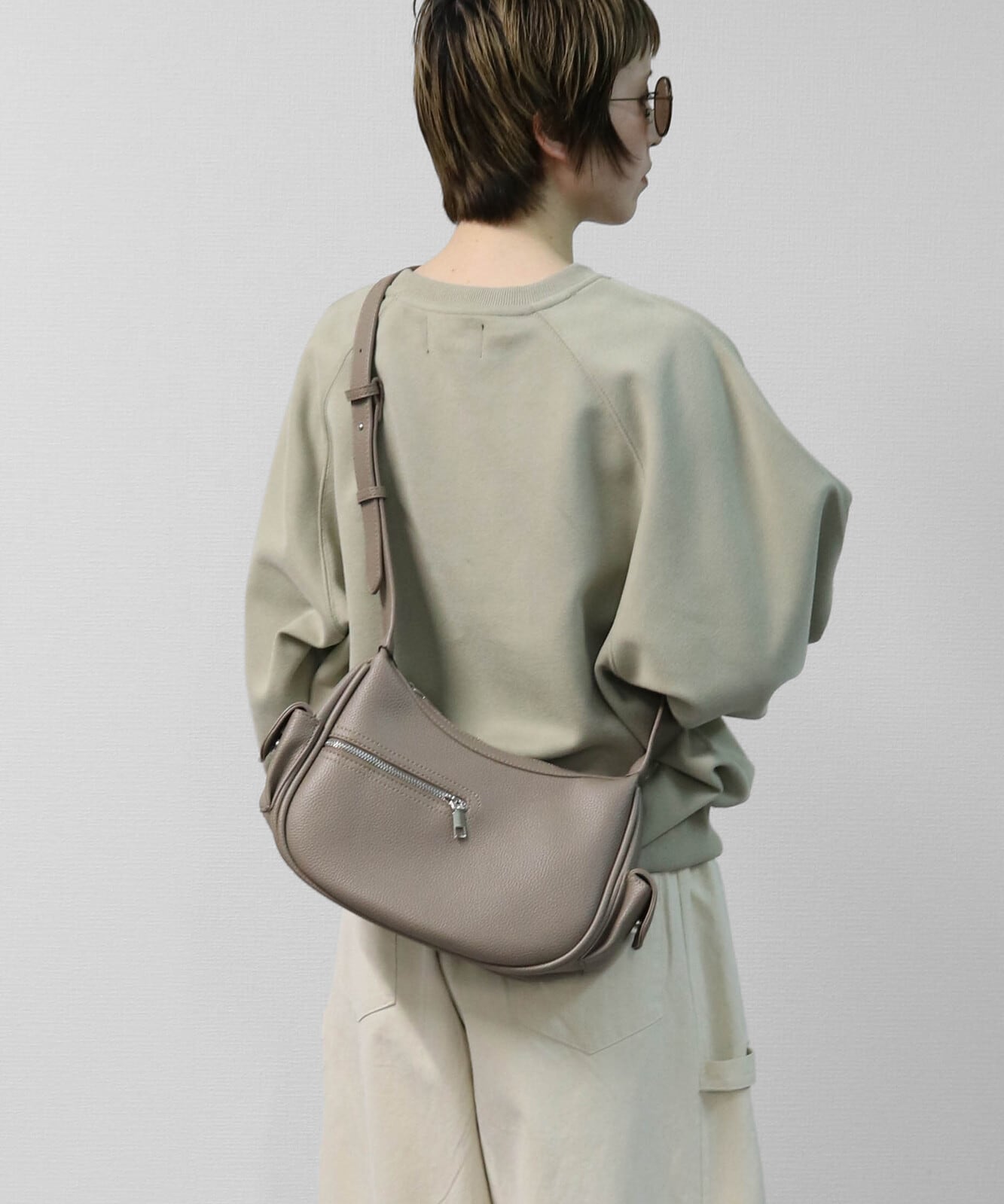 丸みを帯びた柔らかな曲線が、女性らしく大人カジュアルな雰囲気を醸し出すショルダーバッグです。フロントのジップやサイドの立体的なポケットが絶妙なアクセントになり、 シンプルなスタイリングに投入するだけで今っぽい「こなれ感」をプラス。体にフィットするスリムなマチ設計なので、コ ートの上からでもすっきりと持ちやすく、デイリーからお出かけまで幅広く活躍します。