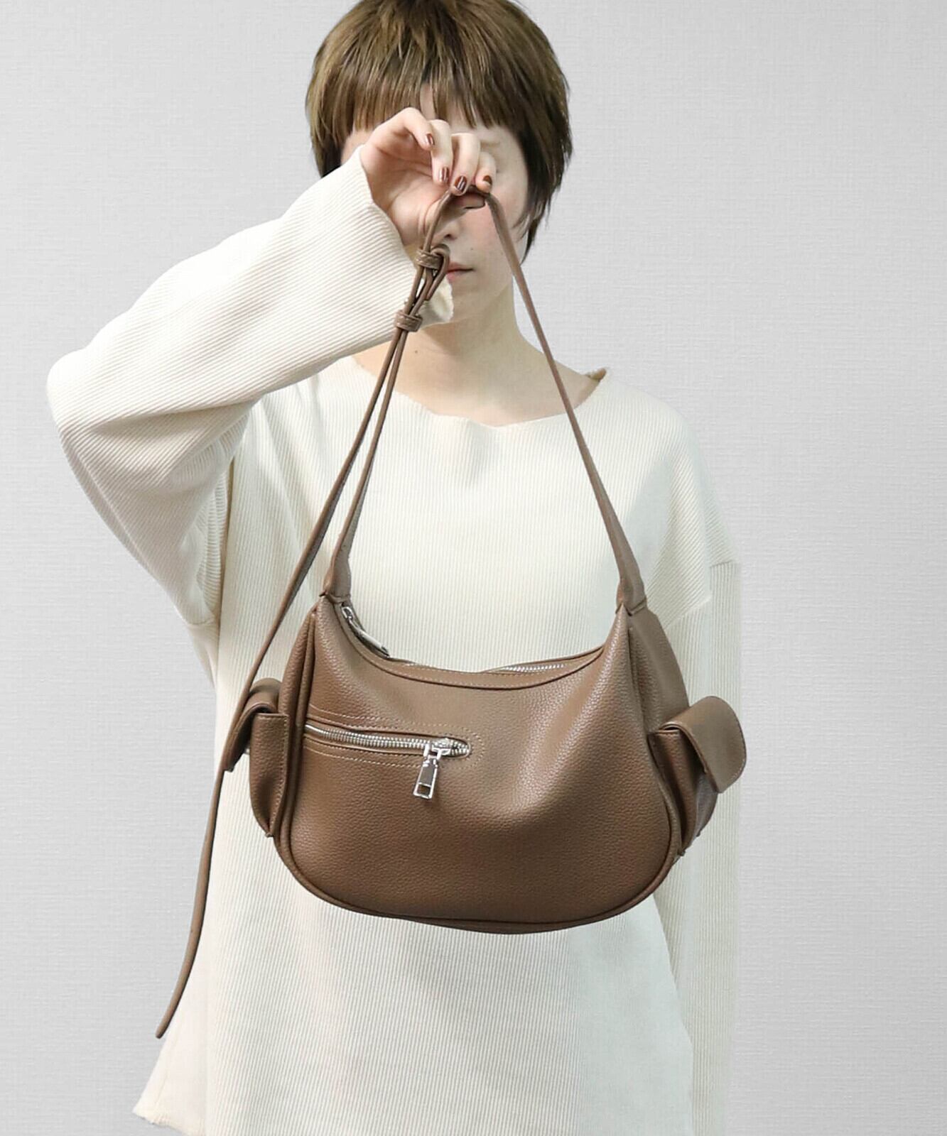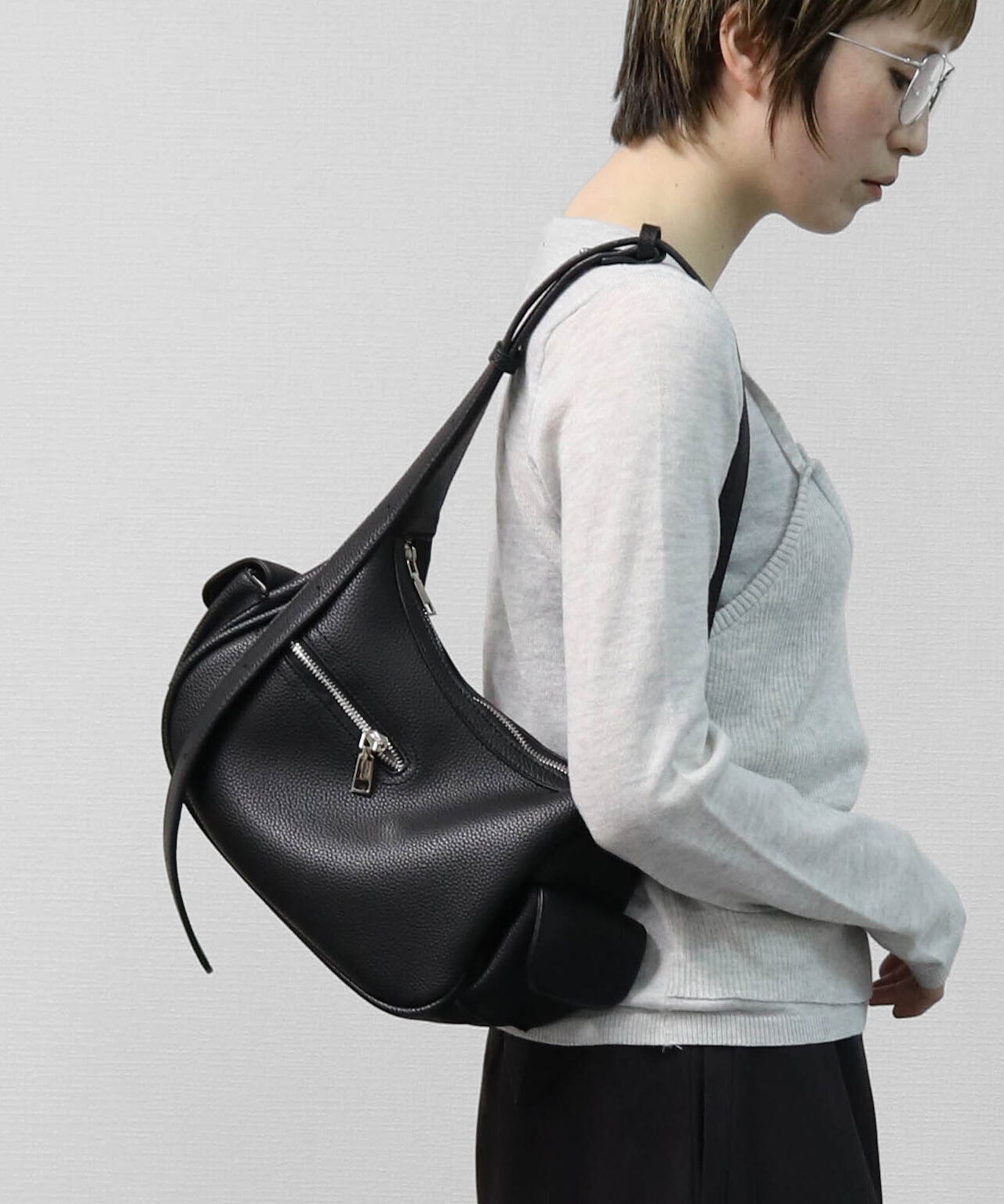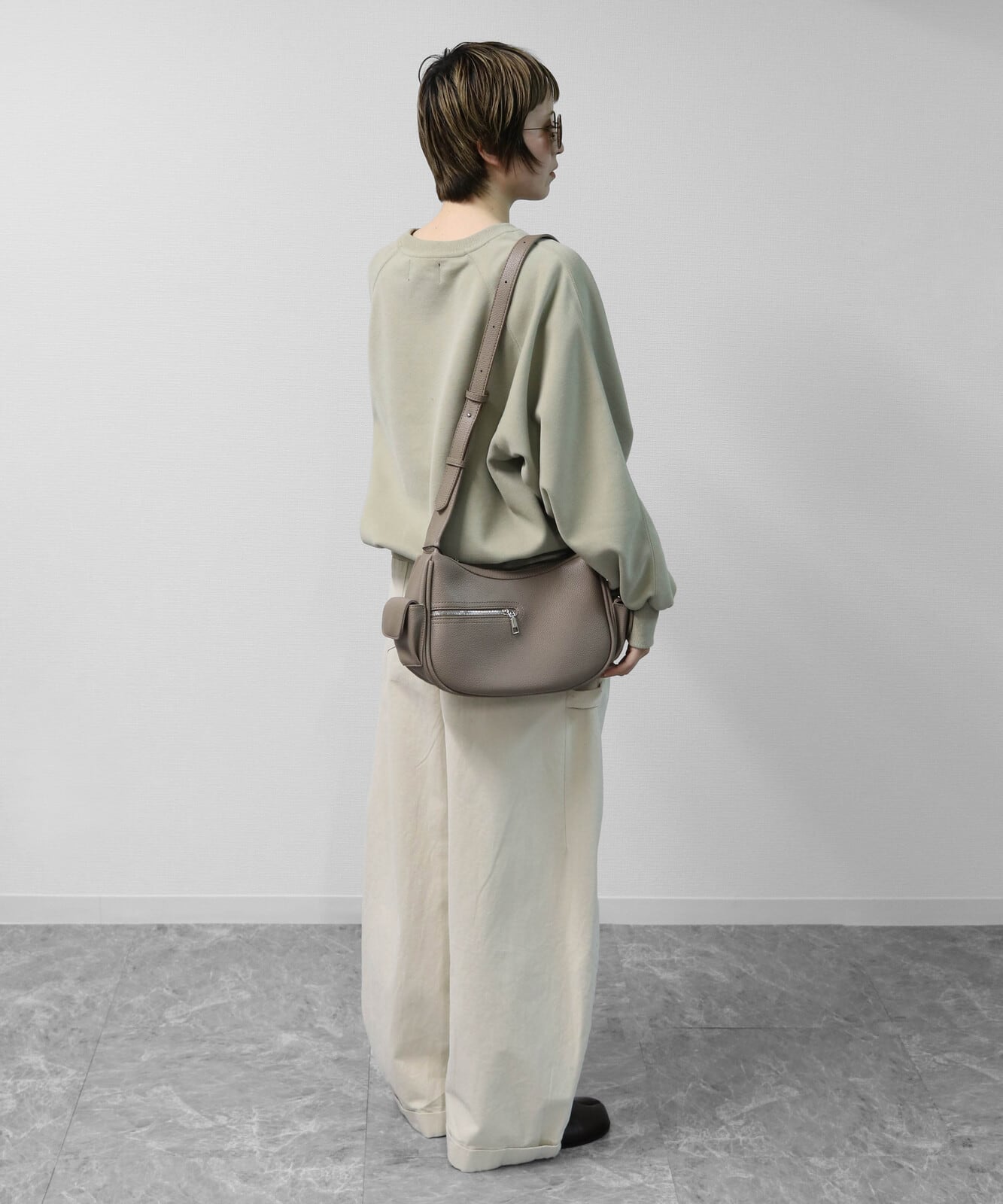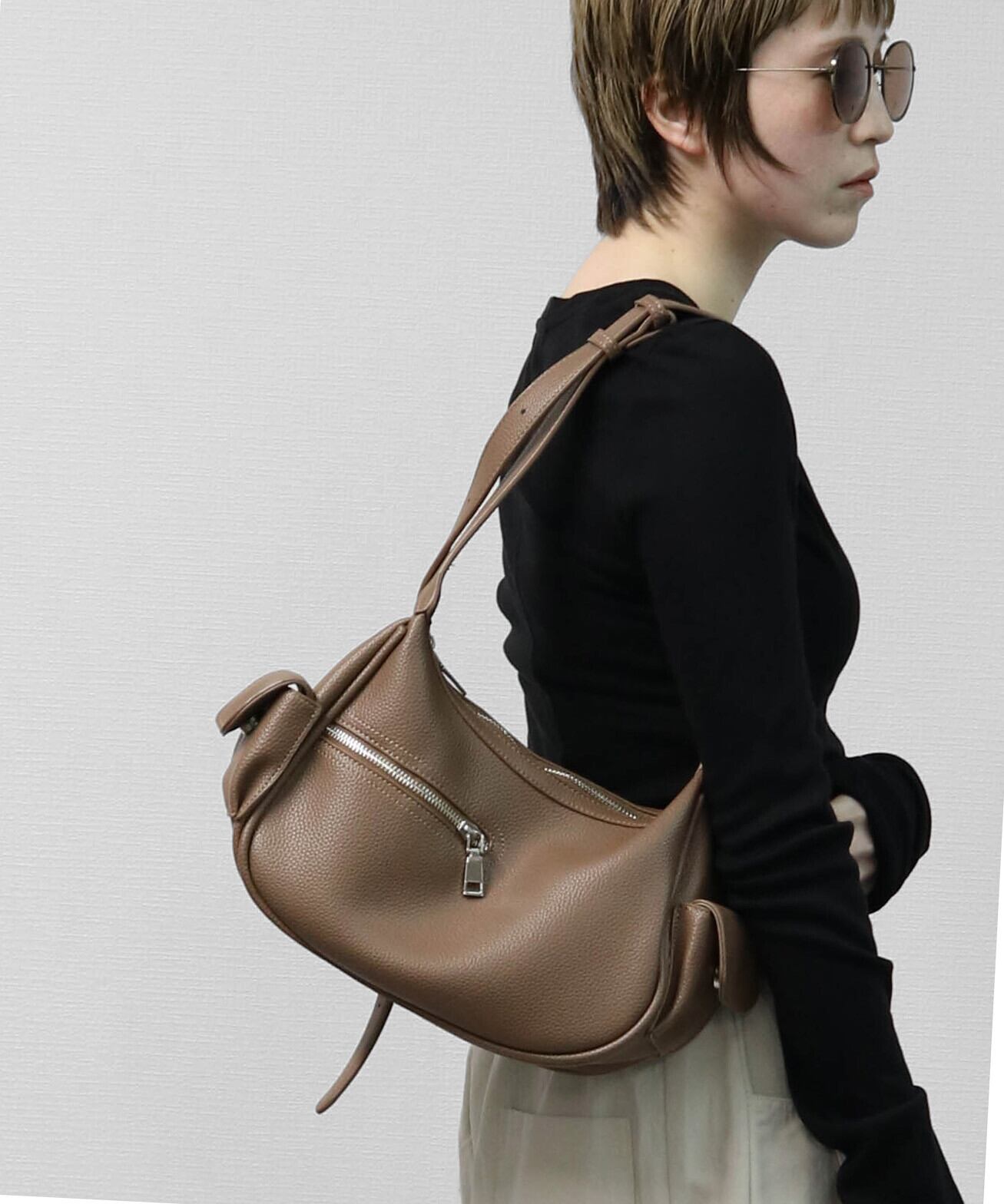 丸みを帯びた柔らかな曲線が、女性らしく大人カジュアルな雰囲気を醸し出すショルダーバッグです。フロントのジップやサイドの立体的なポケットが絶妙なアクセントになり、 シンプルなスタイリングに投入するだけで今っぽい「こなれ感」をプラス。体にフィットするスリムなマチ設計なので、コ ートの上からでもすっきりと持ちやすく、デイリーからお出かけまで幅広く活躍します。