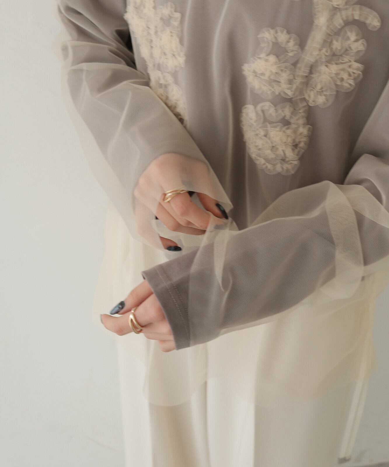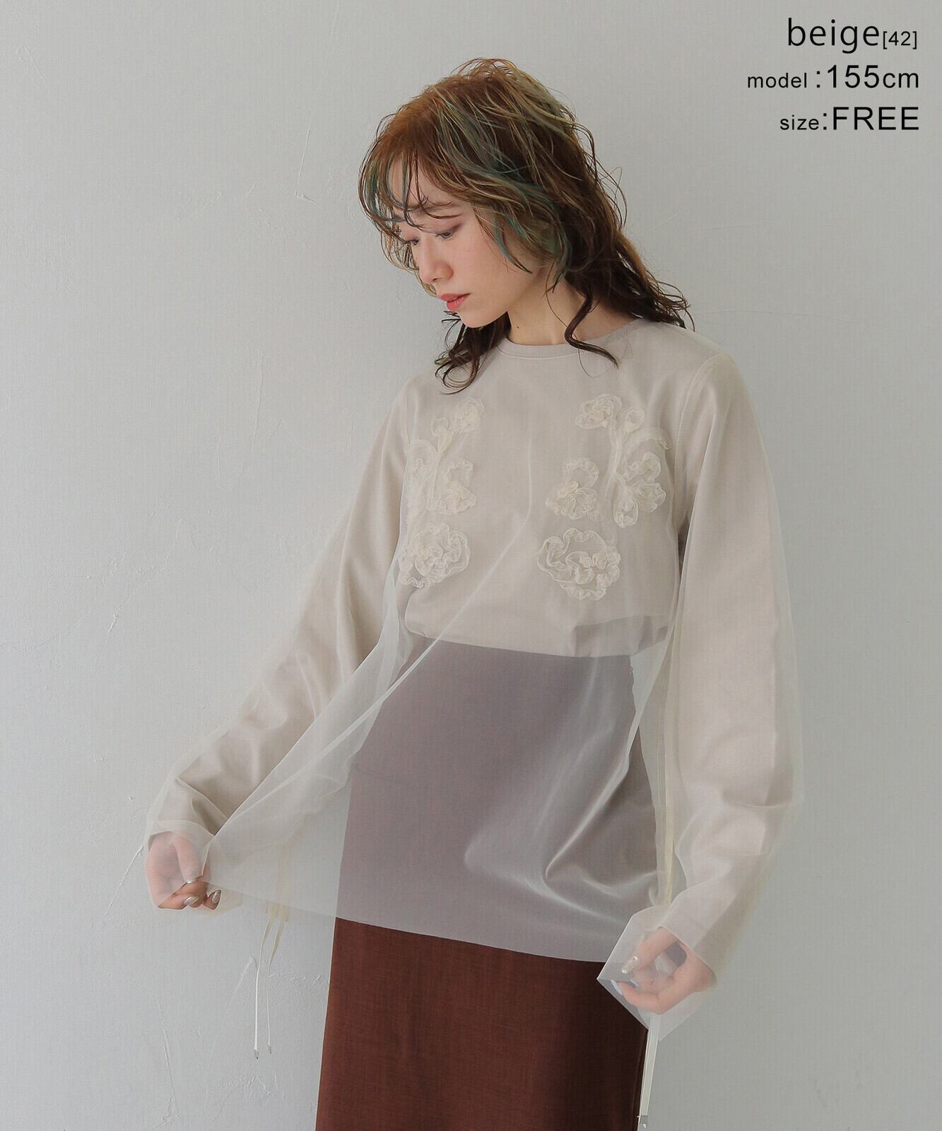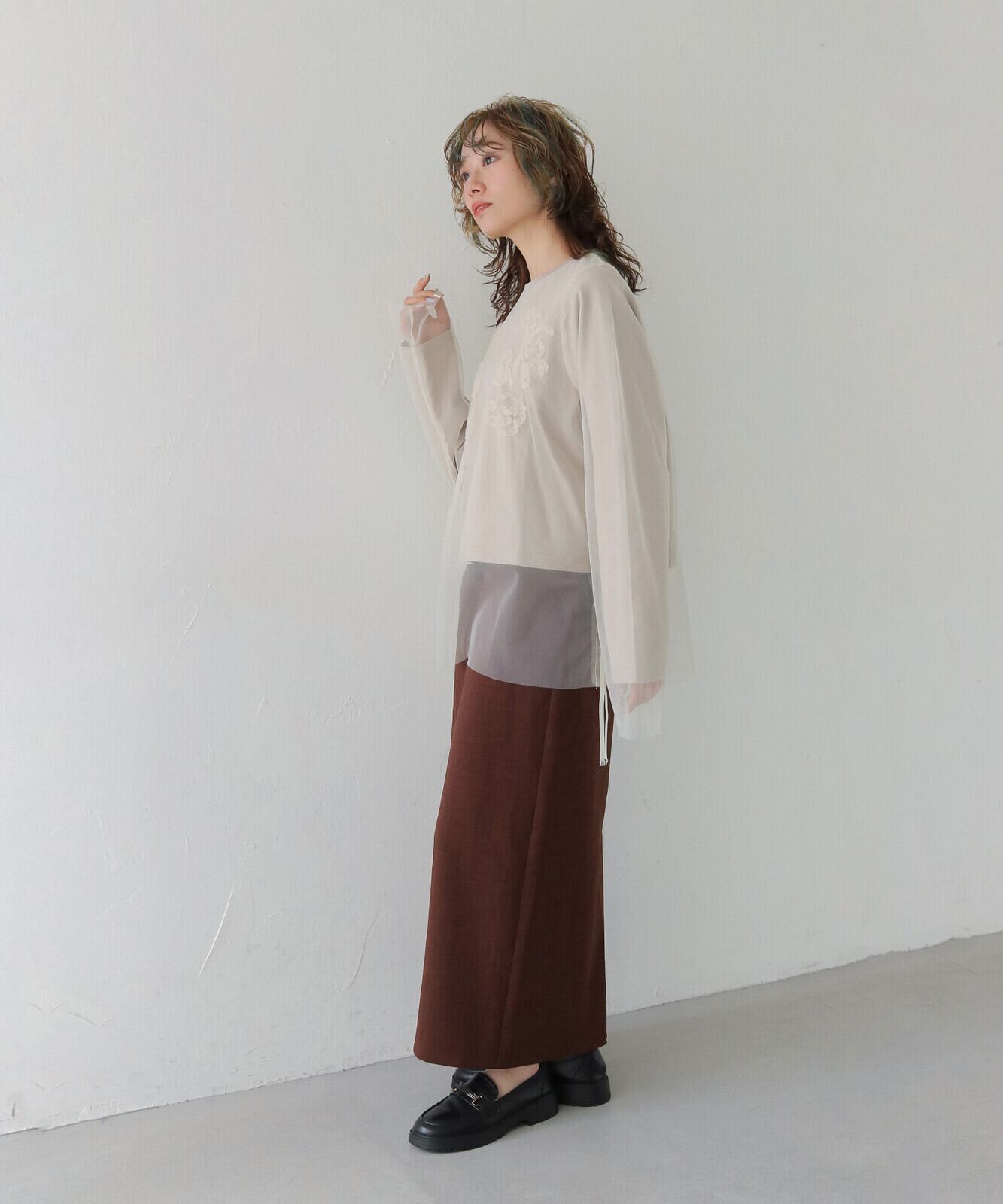 胸元には植物モチーフのテープ刺繍をあしらい、表情のある一枚に。あえてTシャツとチュールを配色にすることで、さり気なくニュアンスのある雰囲気を演出しています。
