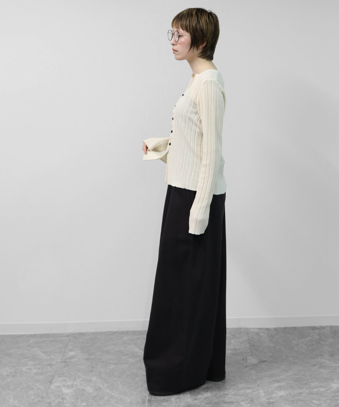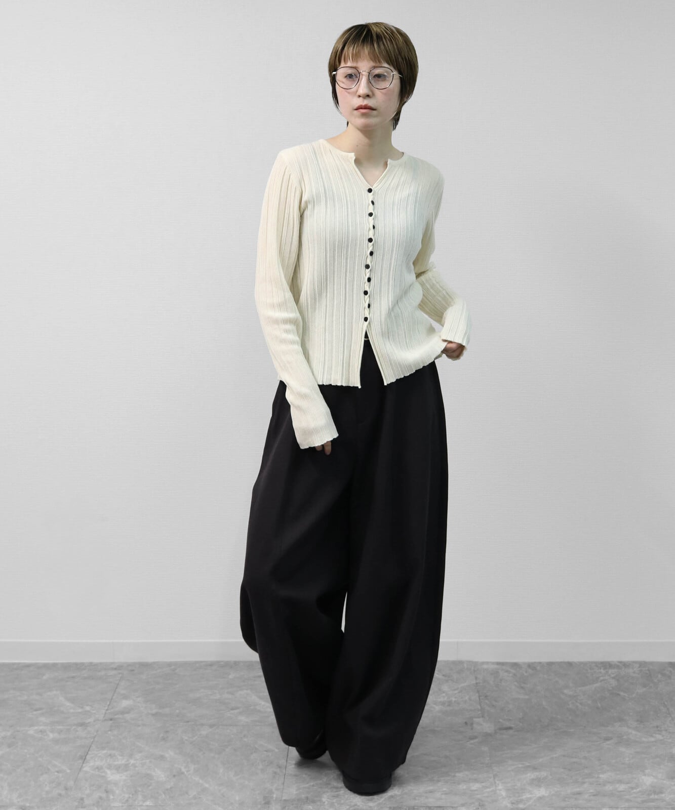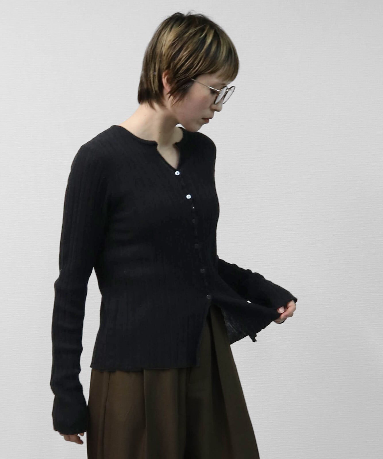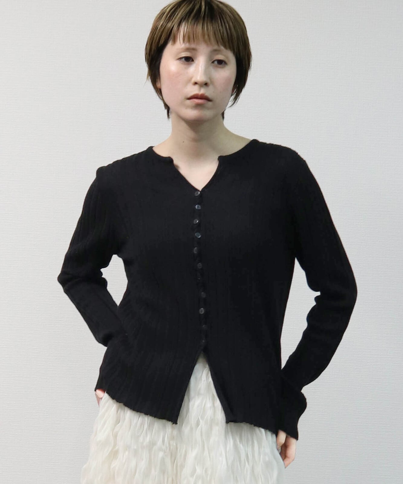 細リブの縦落ちと黒ボタンのコントラストで、ミニマルなのに印象が残るリブニットカーデ。キーネックの“ひと呼吸”が、顔まわりをやさしくシャープに見せてくれます。前を閉じてトップス見え、少し開けてカーデ風など、その日の気分で表情を変えやすい一枚です。