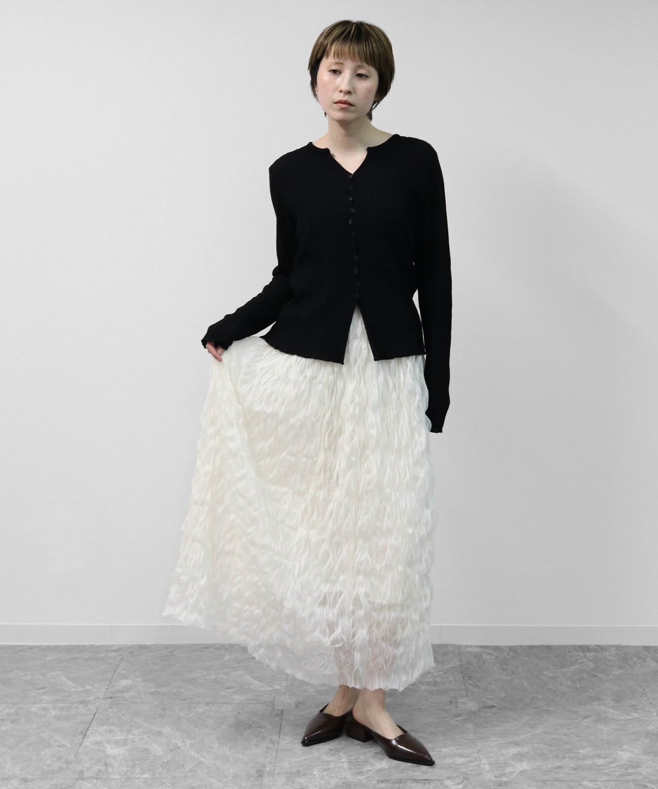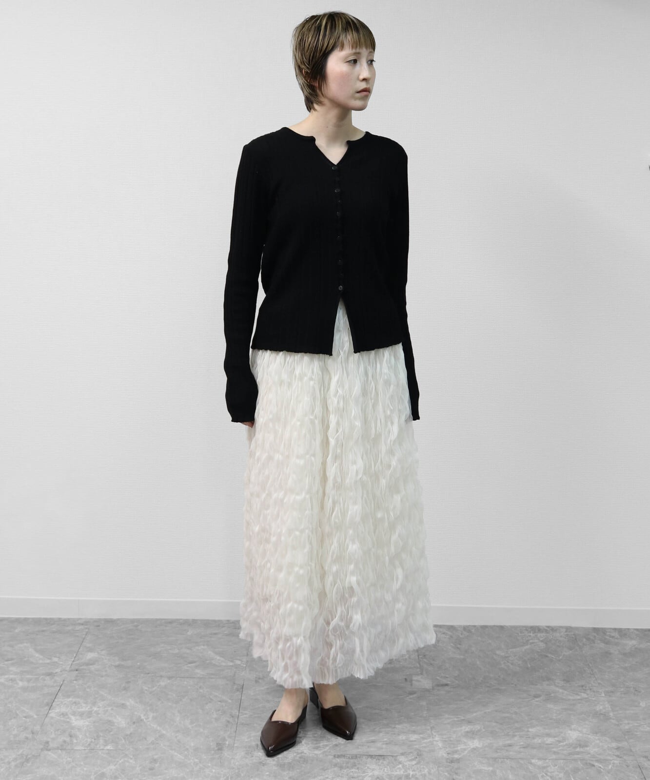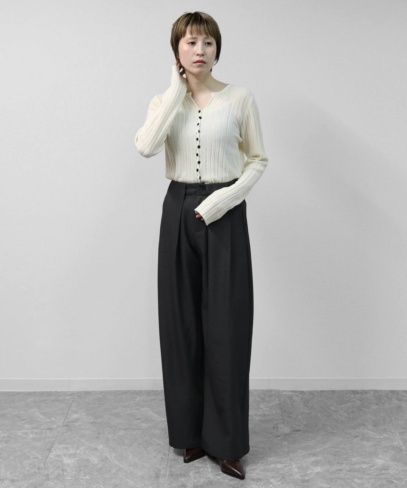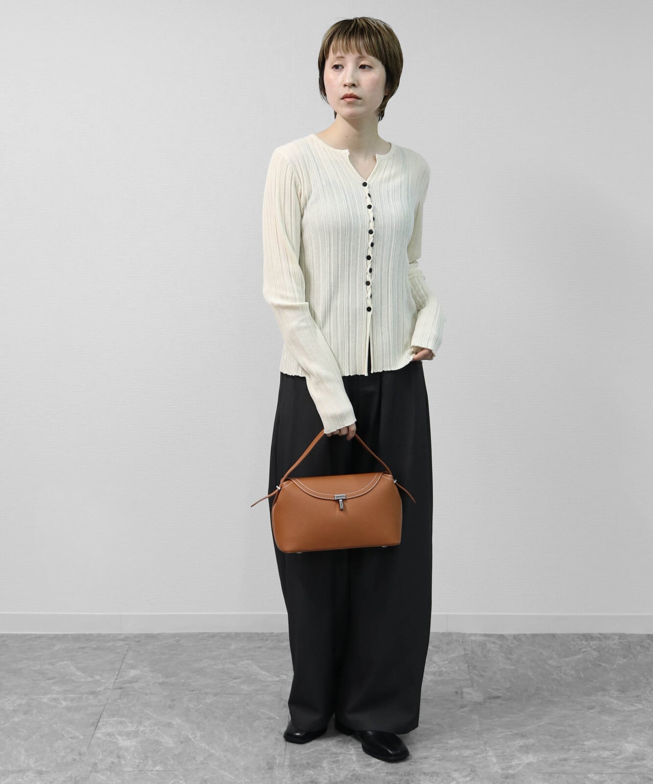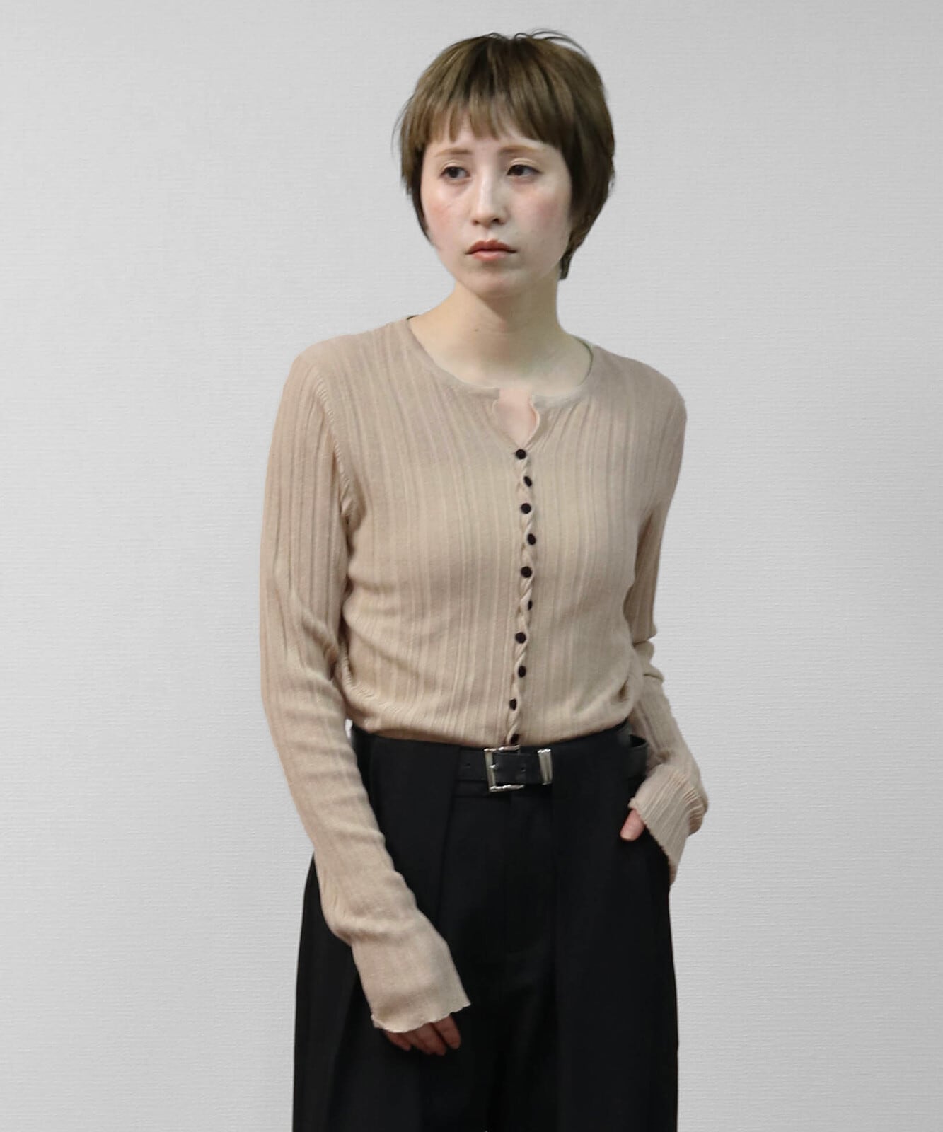 細リブの縦落ちと黒ボタンのコントラストで、ミニマルなのに印象が残るリブニットカーデ。キーネックの“ひと呼吸”が、顔まわりをやさしくシャープに見せてくれます。前を閉じてトップス見え、少し開けてカーデ風など、その日の気分で表情を変えやすい一枚です。