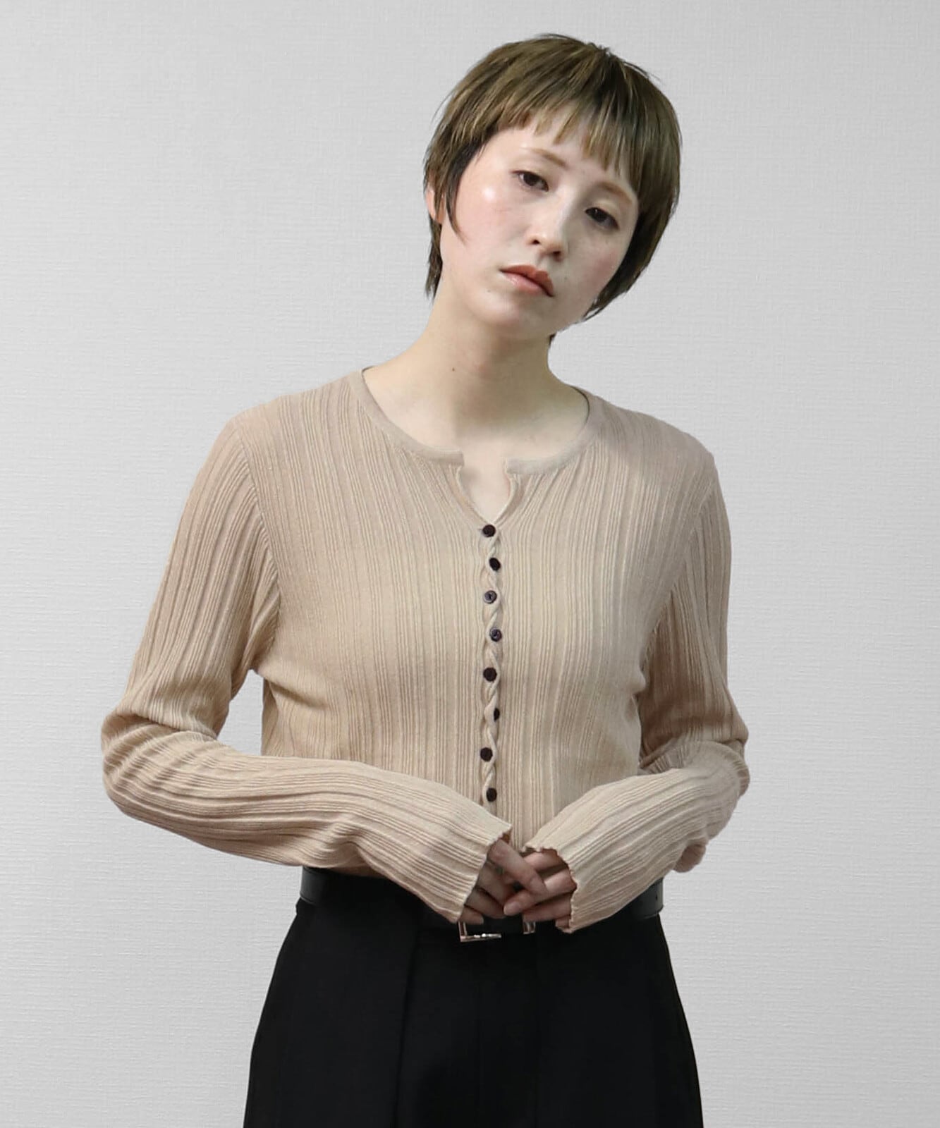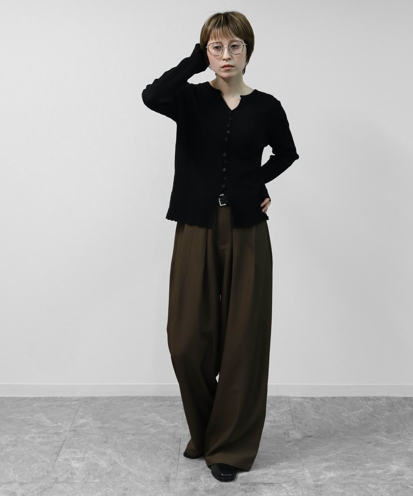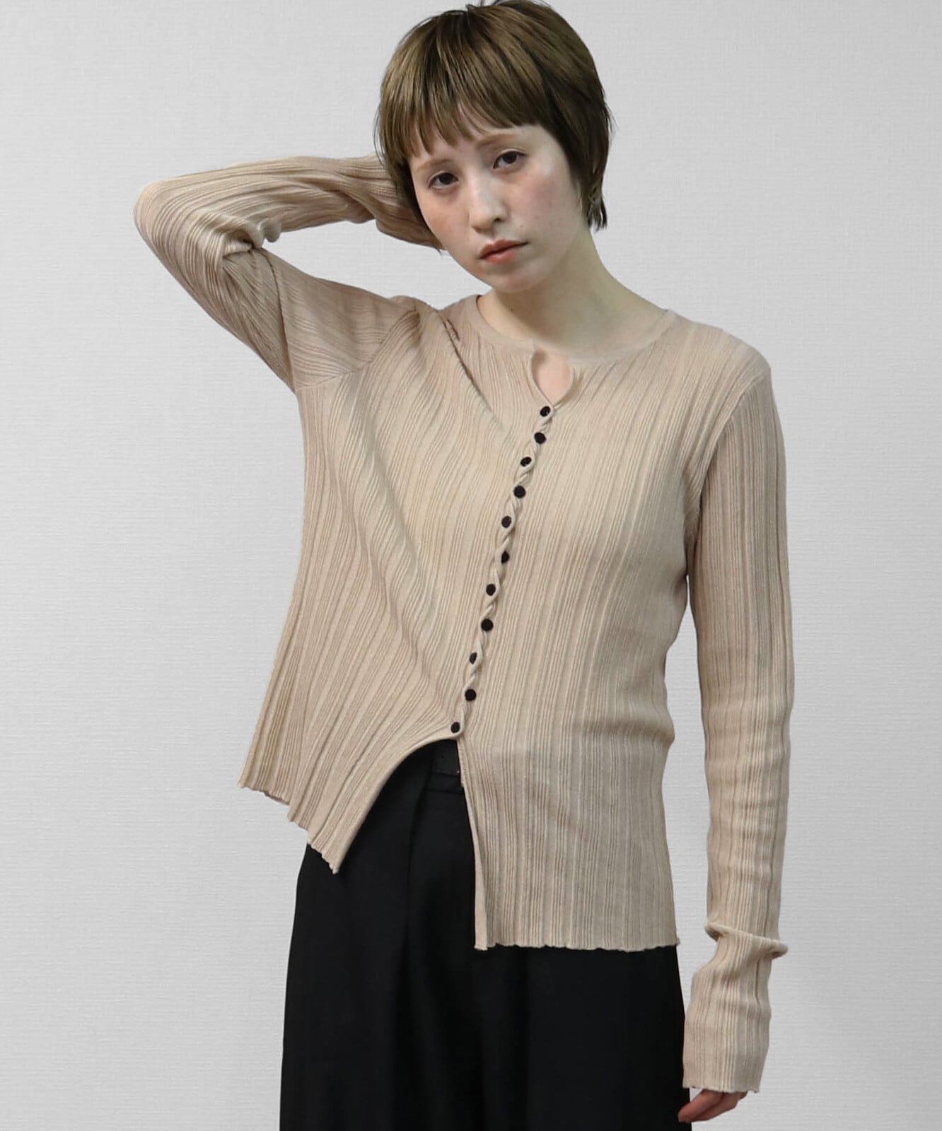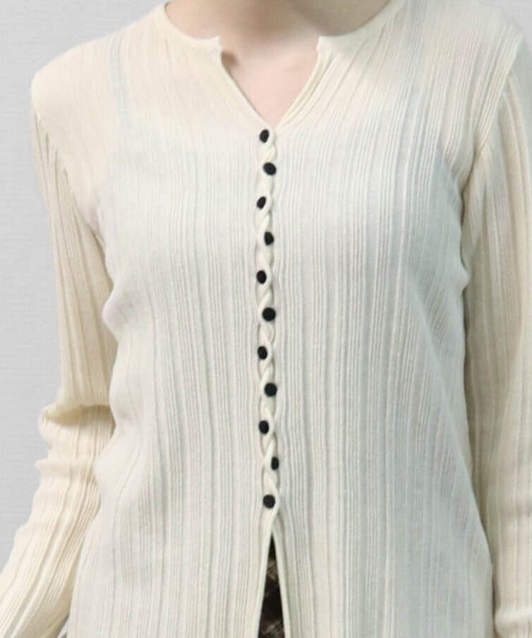 ・キーネックの小さな切れ込みで、首元に抜け感 ・黒ボタンのラインが効いた、アシンメトリー見えのアクセント